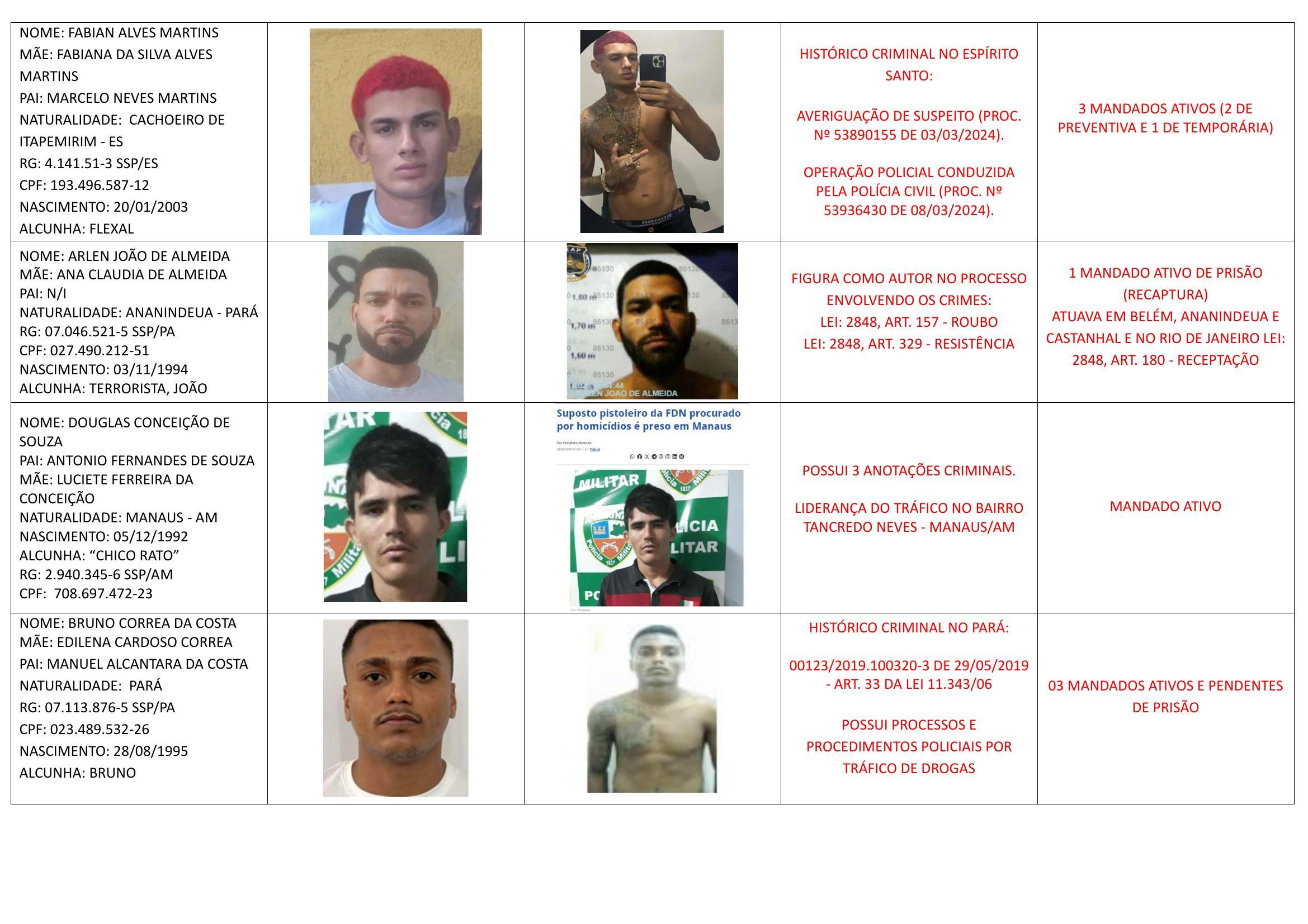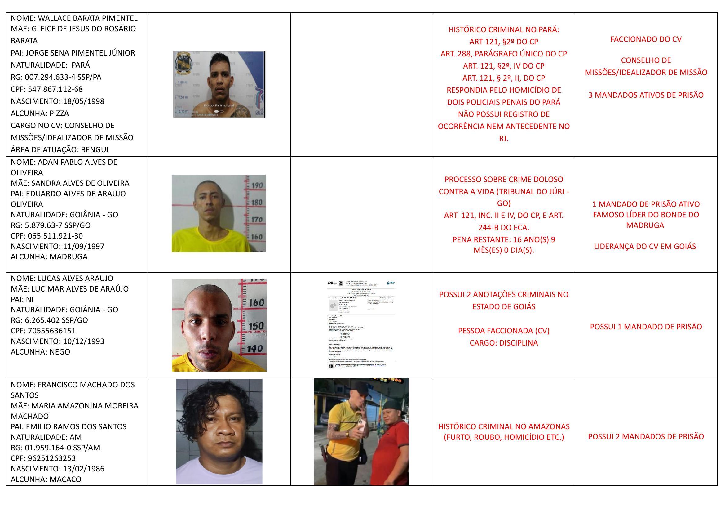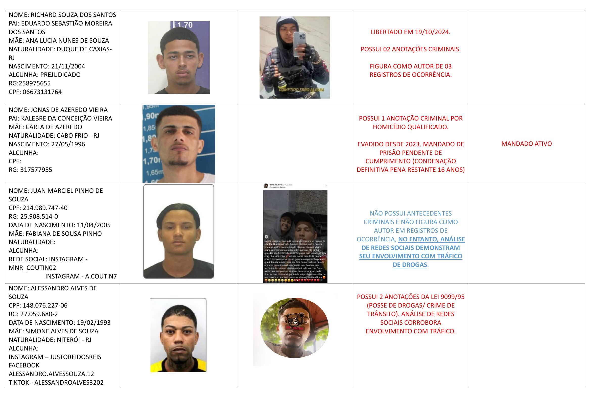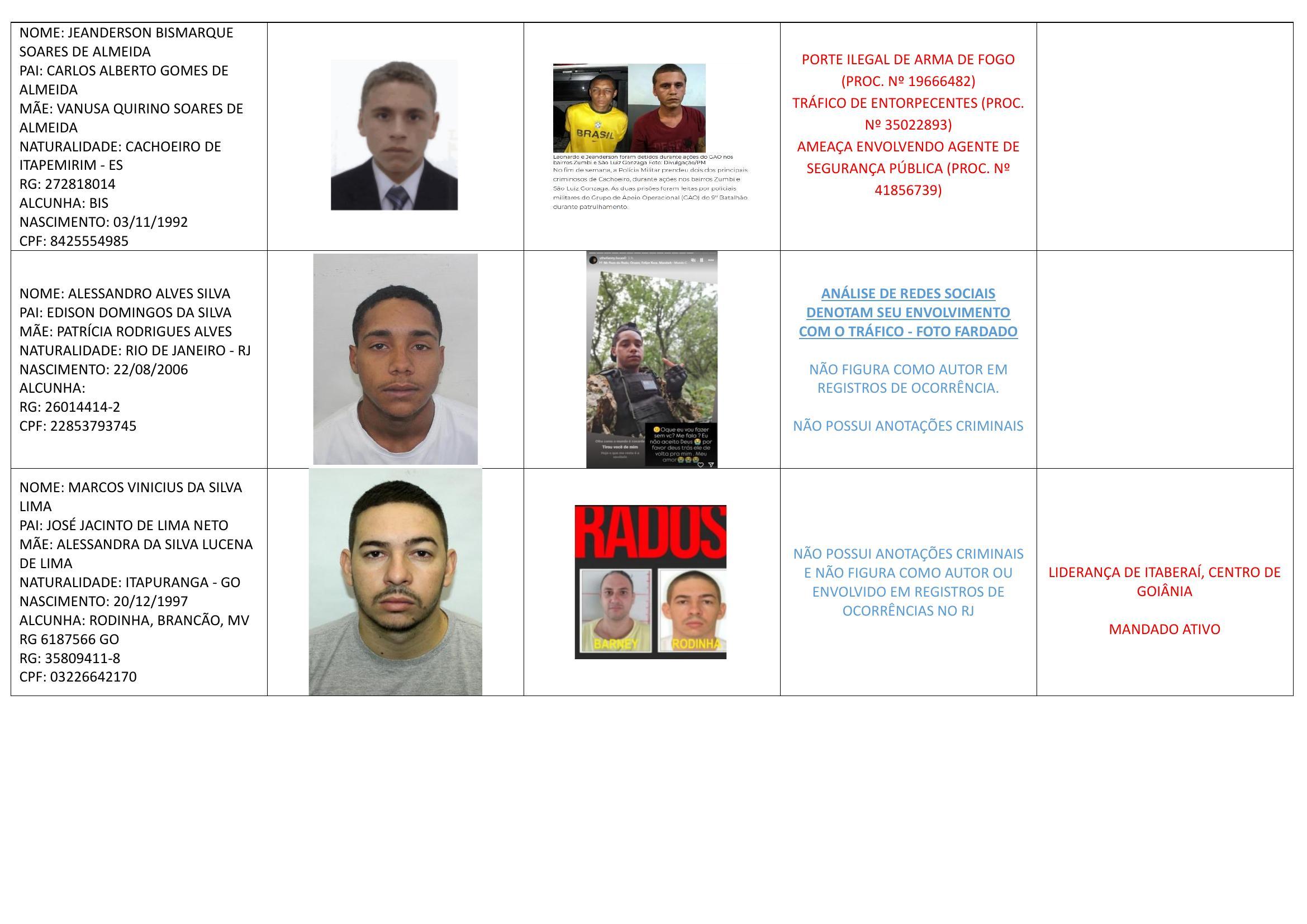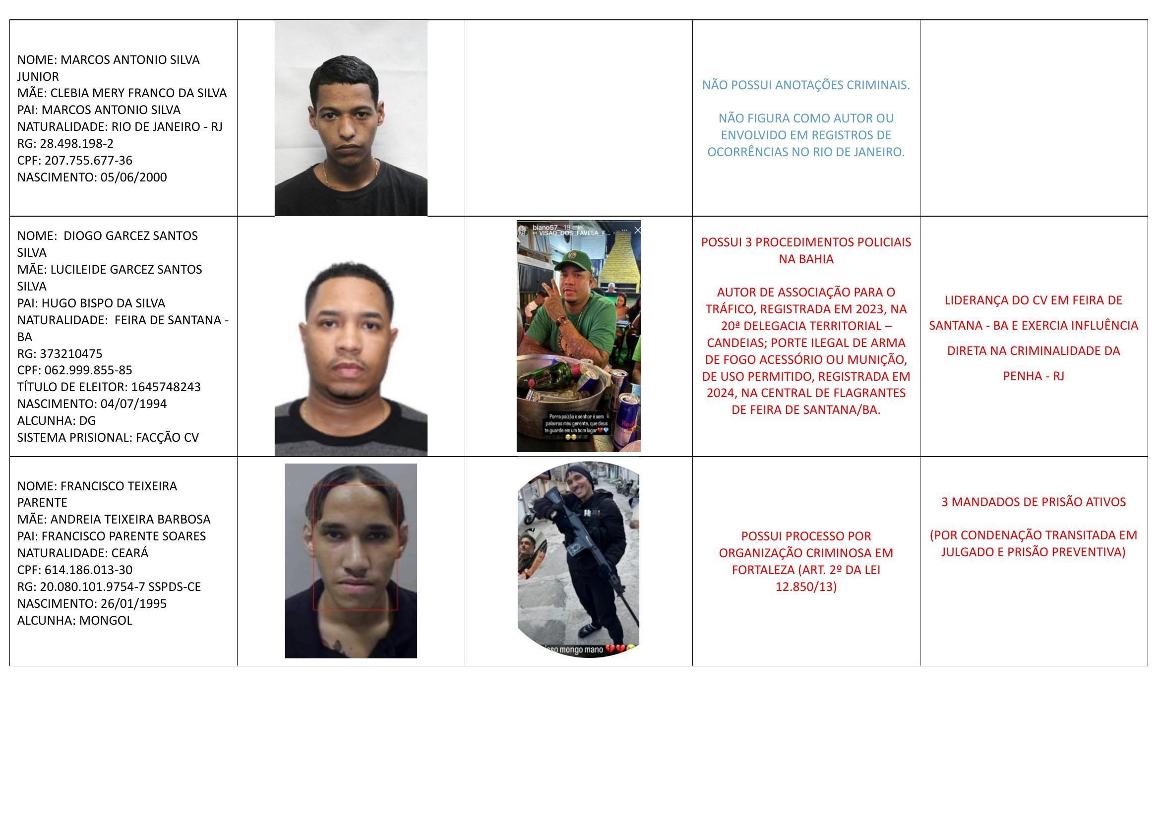 O trabalho de inteligência desenvolvido pela cúpula de Segurança Pública do estado identificou que 59 tinham mandados de prisão pendentes, pelo menos 97 apresentavam históricos criminais relevantes e, dos 17 que não apresentaram histórico criminal, 12 apresentaram indícios de participação no tráfico em suas redes sociais. A lista mostra, ainda, que 62 neutralizados são naturais de outros estados – mais da metade. Até o momento, 19 do Pará, 9 do Amazonas, 12 da Bahia, 4 do Ceará, 2 da Paraíba, 1 do Maranhão, 9 de Goiás, 1 do Mato Grosso, 3 do Espírito Santo, 1 de São Paulo e 1 do Distrito Federal. O relatório indica que, no Rio de Janeiro, há chefes de organizações criminosas de 11 estados da federação, de quatro das cinco regiões do país.