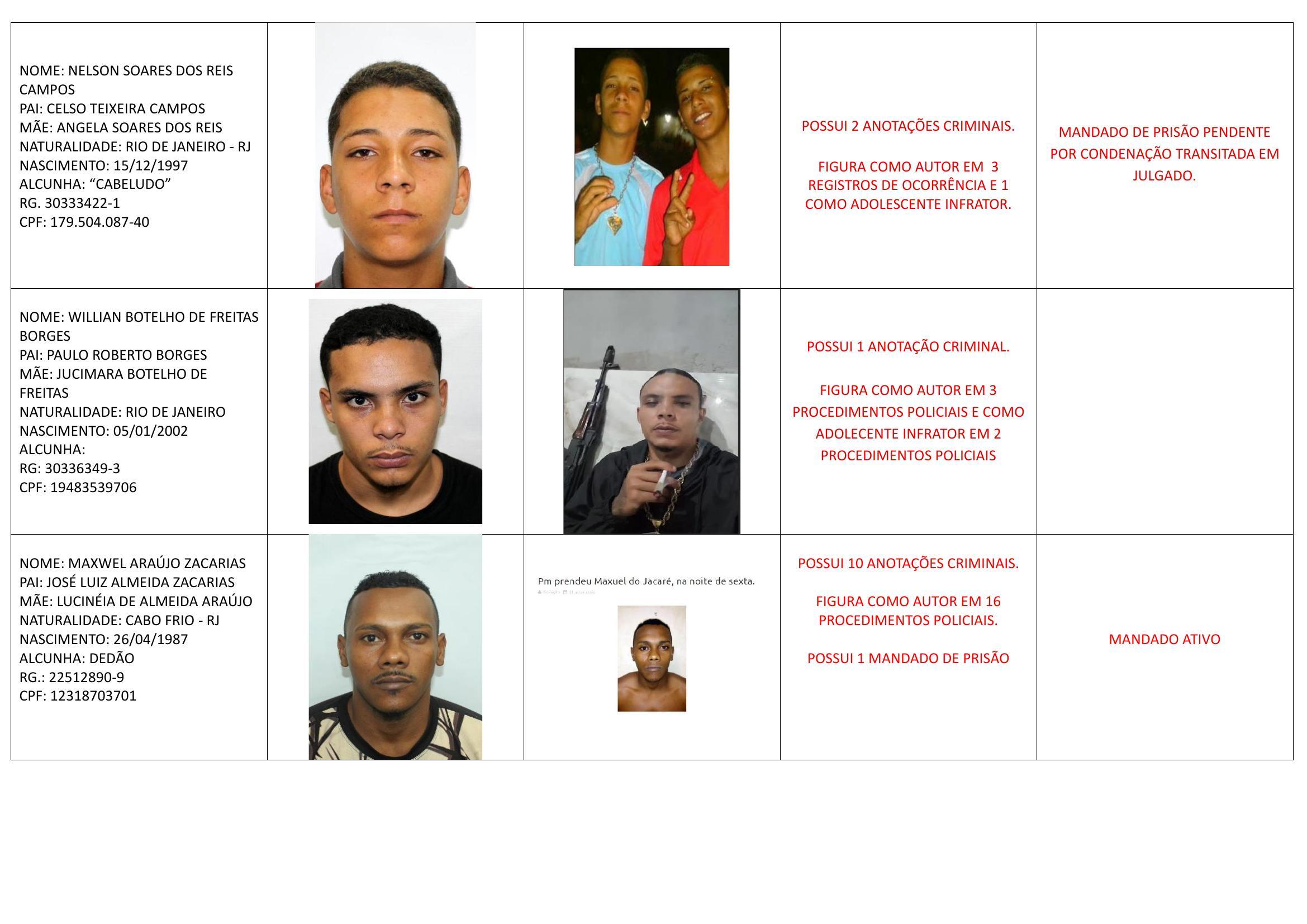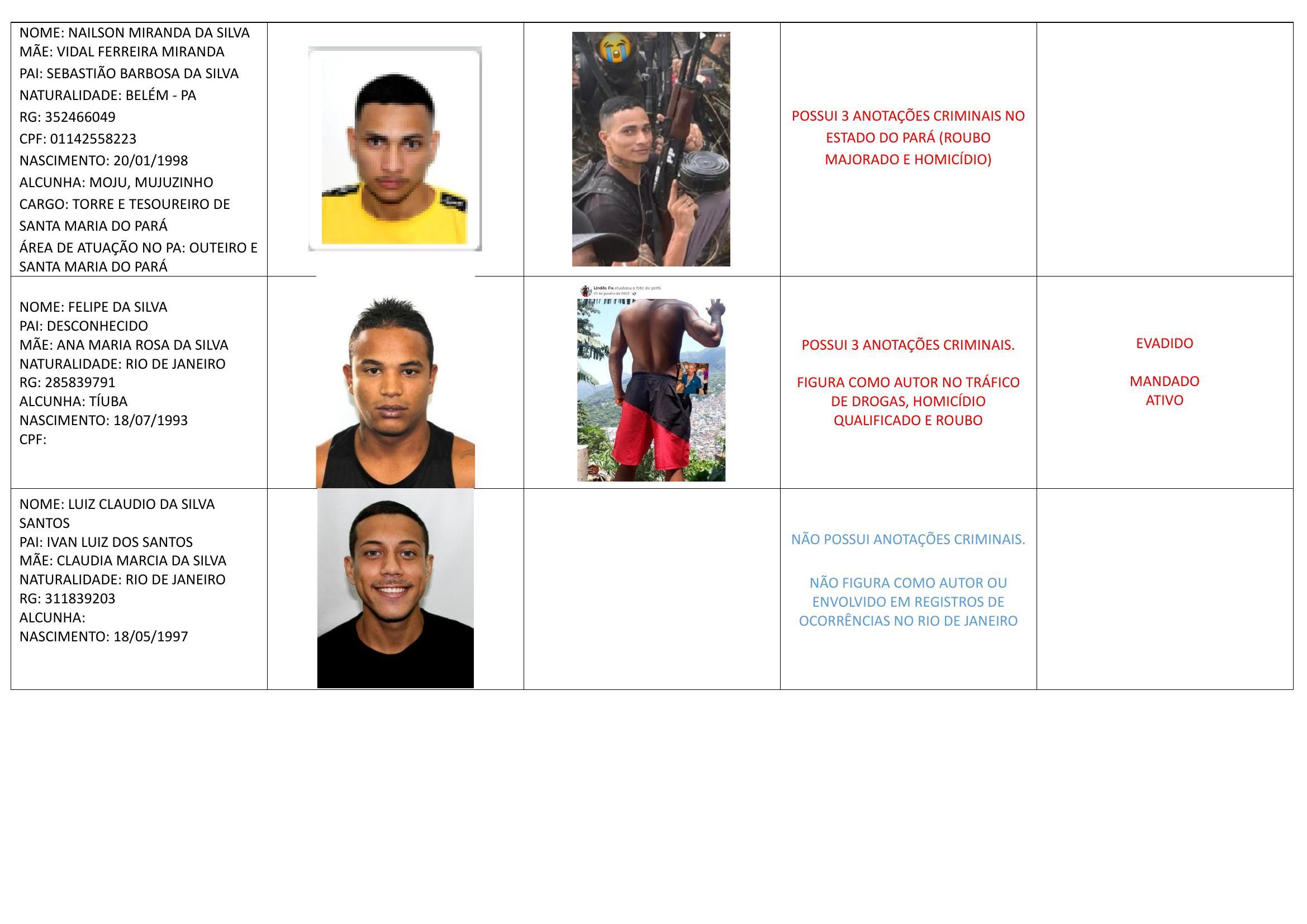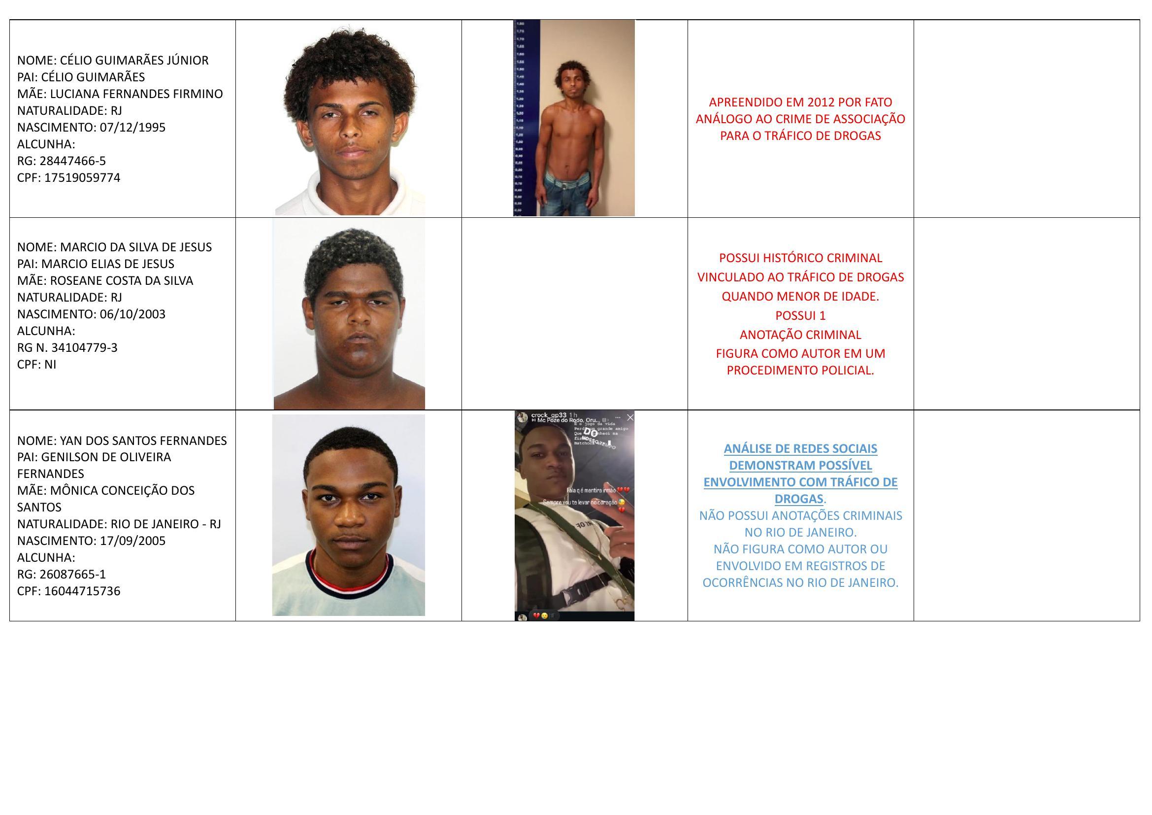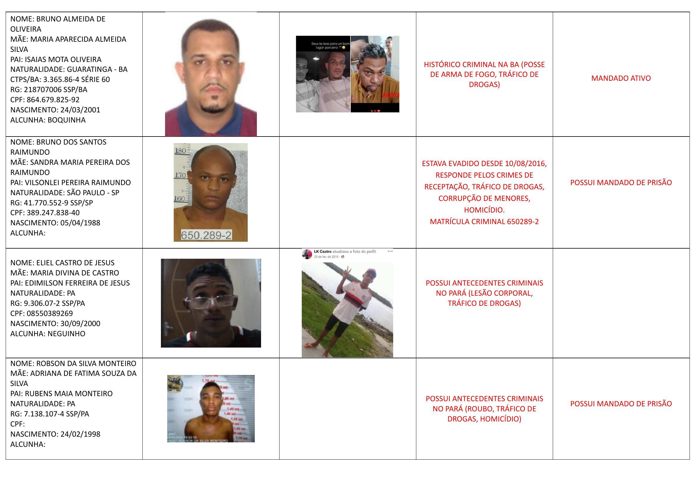 O trabalho de inteligência desenvolvido pela cúpula de Segurança Pública do estado identificou que 59 tinham mandados de prisão pendentes, pelo menos 97 apresentavam históricos criminais relevantes e, dos 17 que não apresentaram histórico criminal, 12 apresentaram indícios de participação no tráfico em suas redes sociais. A lista mostra, ainda, que 62 neutralizados são naturais de outros estados – mais da metade. Até o momento, 19 do Pará, 9 do Amazonas, 12 da Bahia, 4 do Ceará, 2 da Paraíba, 1 do Maranhão, 9 de Goiás, 1 do Mato Grosso, 3 do Espírito Santo, 1 de São Paulo e 1 do Distrito Federal. O relatório indica que, no Rio de Janeiro, há chefes de organizações criminosas de 11 estados da federação, de quatro das cinco regiões do país.