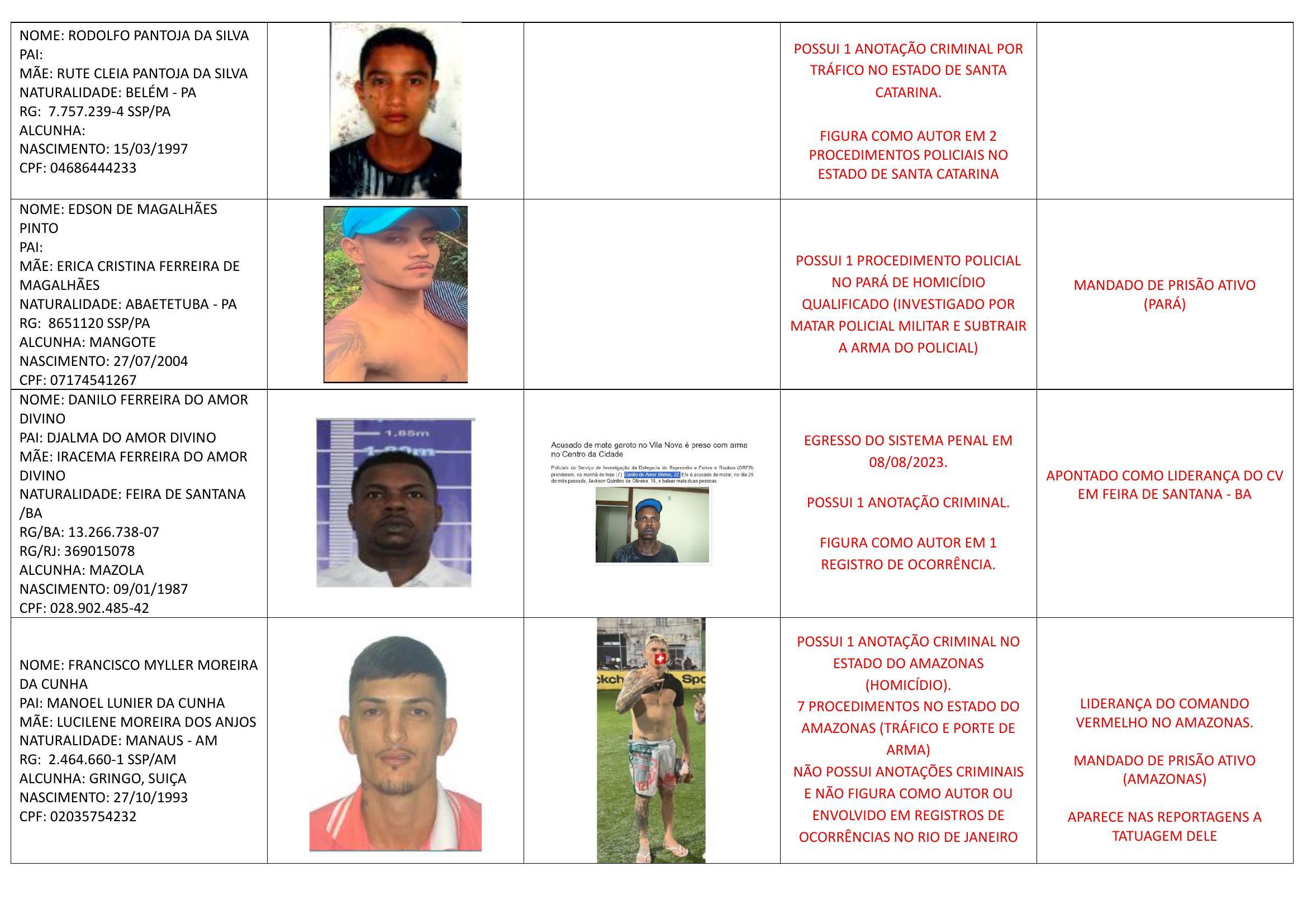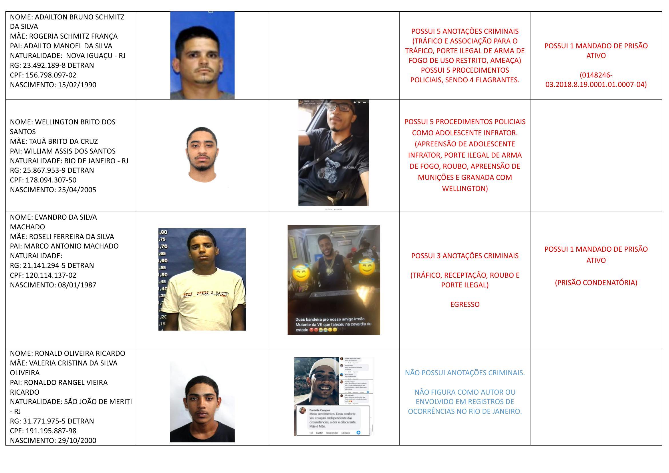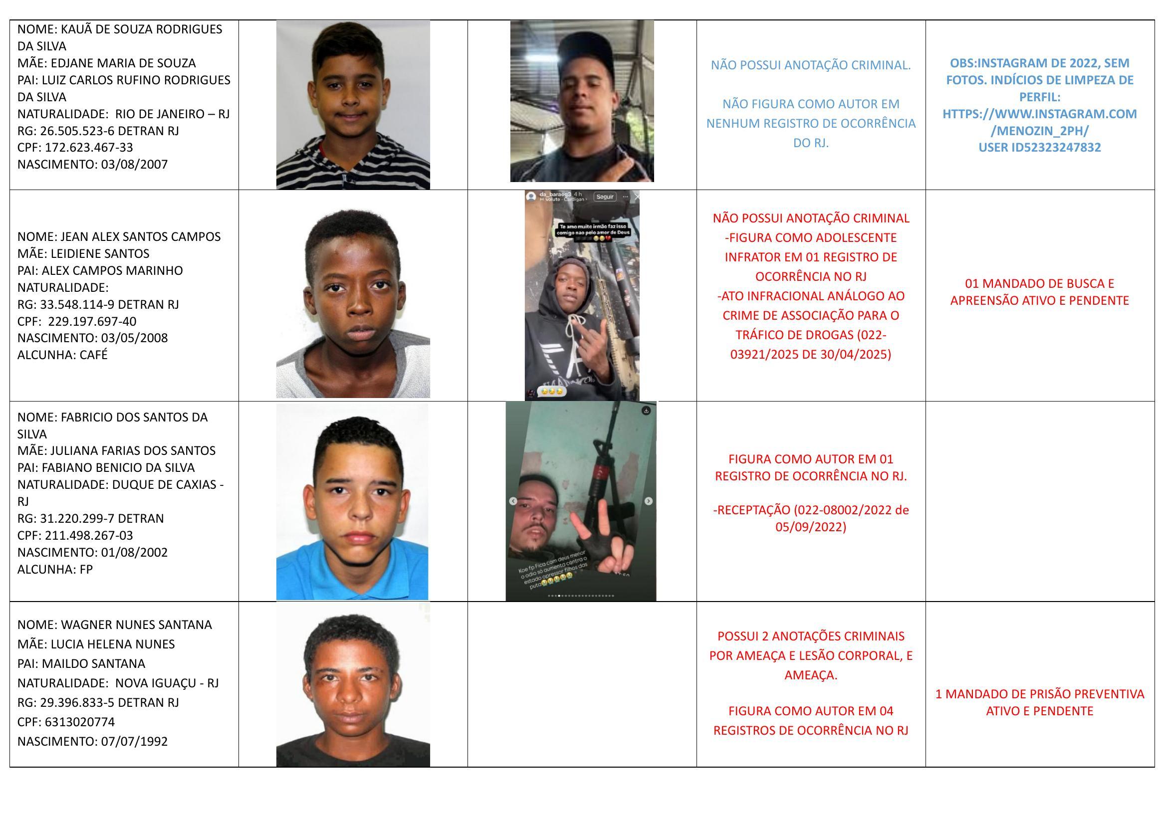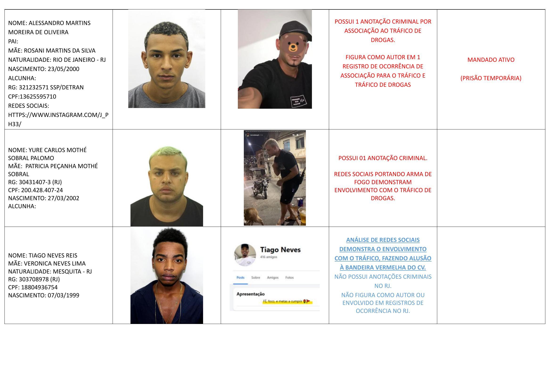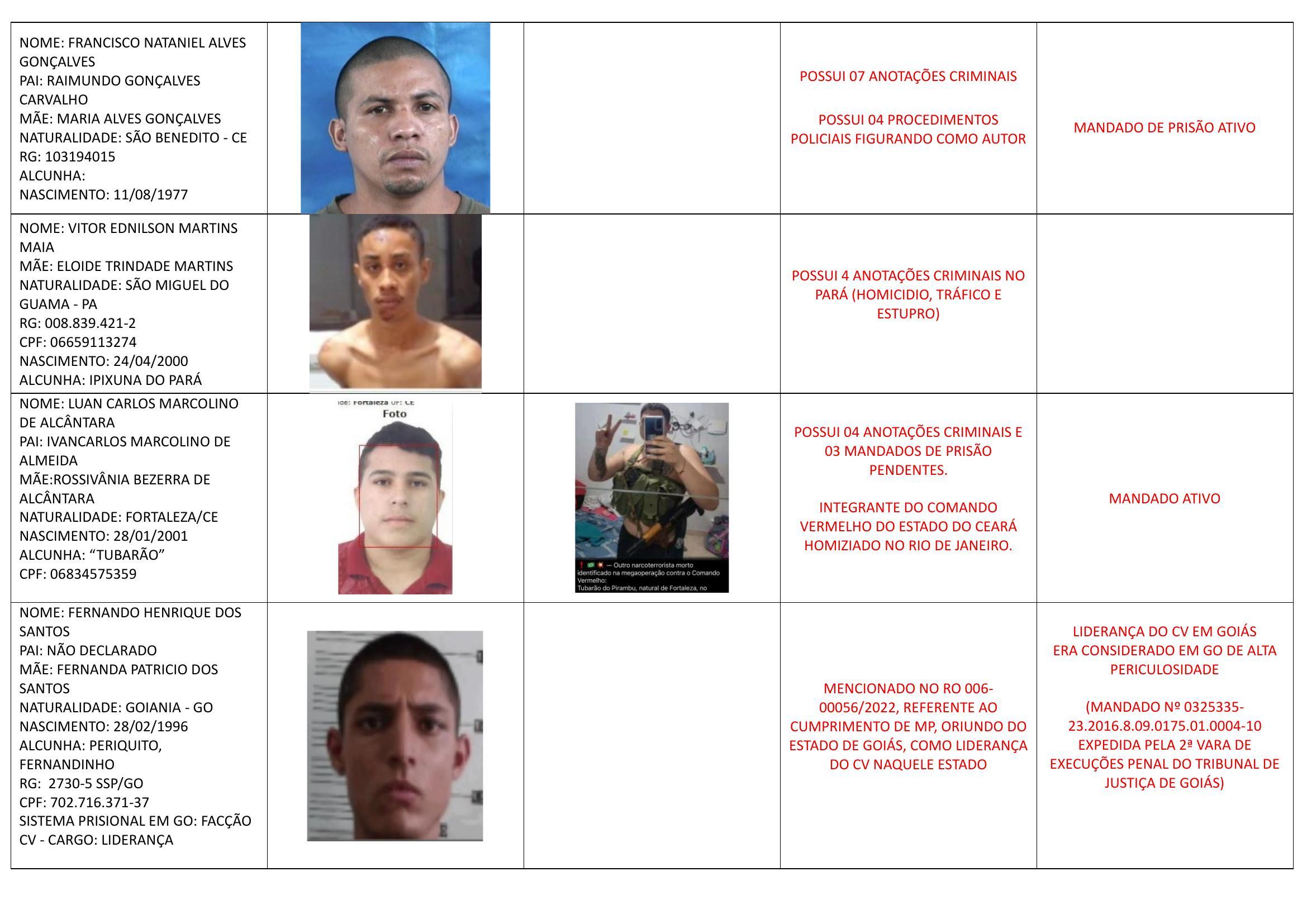 O trabalho de inteligência desenvolvido pela cúpula de Segurança Pública do estado identificou que 59 tinham mandados de prisão pendentes, pelo menos 97 apresentavam históricos criminais relevantes e, dos 17 que não apresentaram histórico criminal, 12 apresentaram indícios de participação no tráfico em suas redes sociais. A lista mostra, ainda, que 62 neutralizados são naturais de outros estados – mais da metade. Até o momento, 19 do Pará, 9 do Amazonas, 12 da Bahia, 4 do Ceará, 2 da Paraíba, 1 do Maranhão, 9 de Goiás, 1 do Mato Grosso, 3 do Espírito Santo, 1 de São Paulo e 1 do Distrito Federal. O relatório indica que, no Rio de Janeiro, há chefes de organizações criminosas de 11 estados da federação, de quatro das cinco regiões do país.