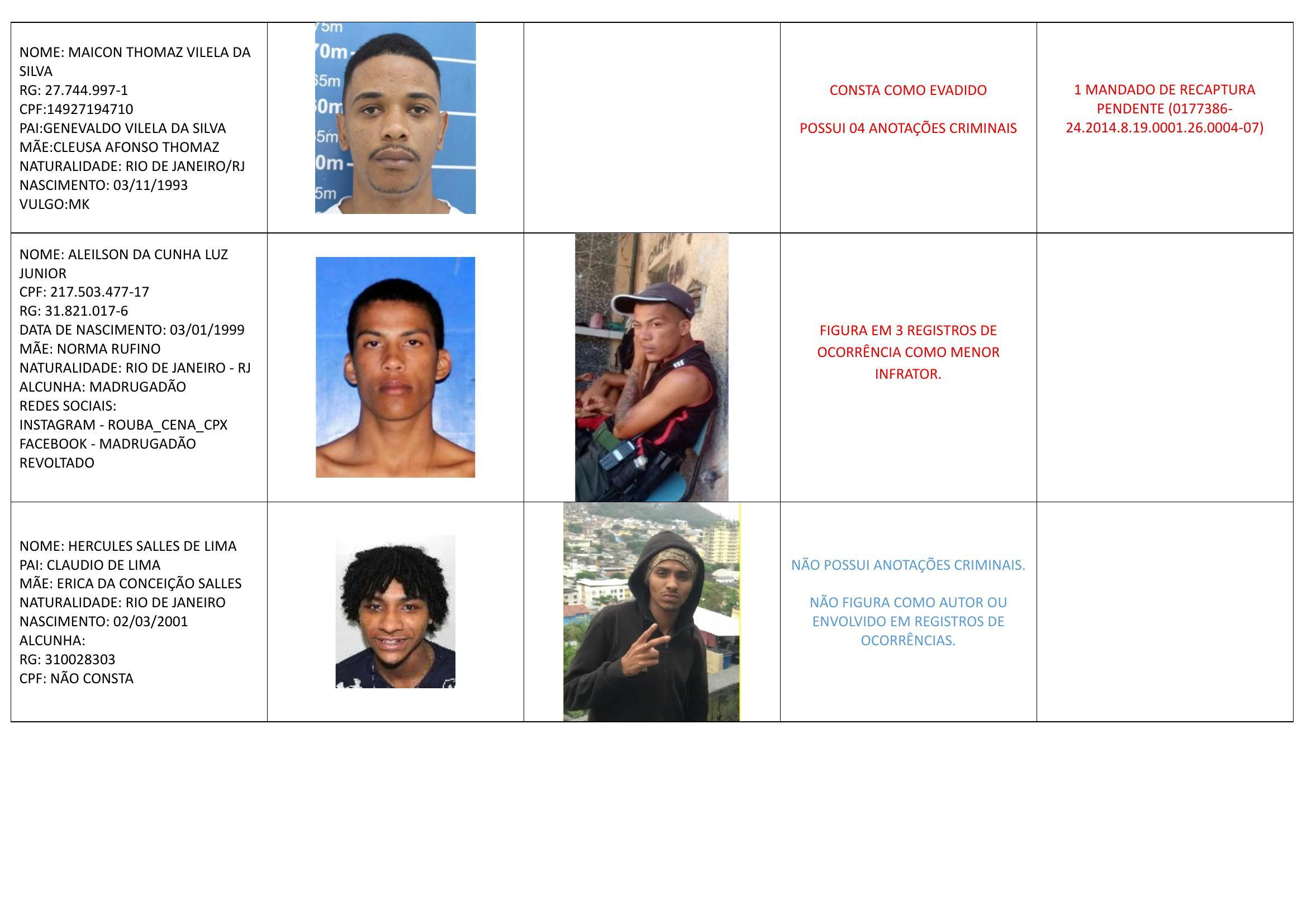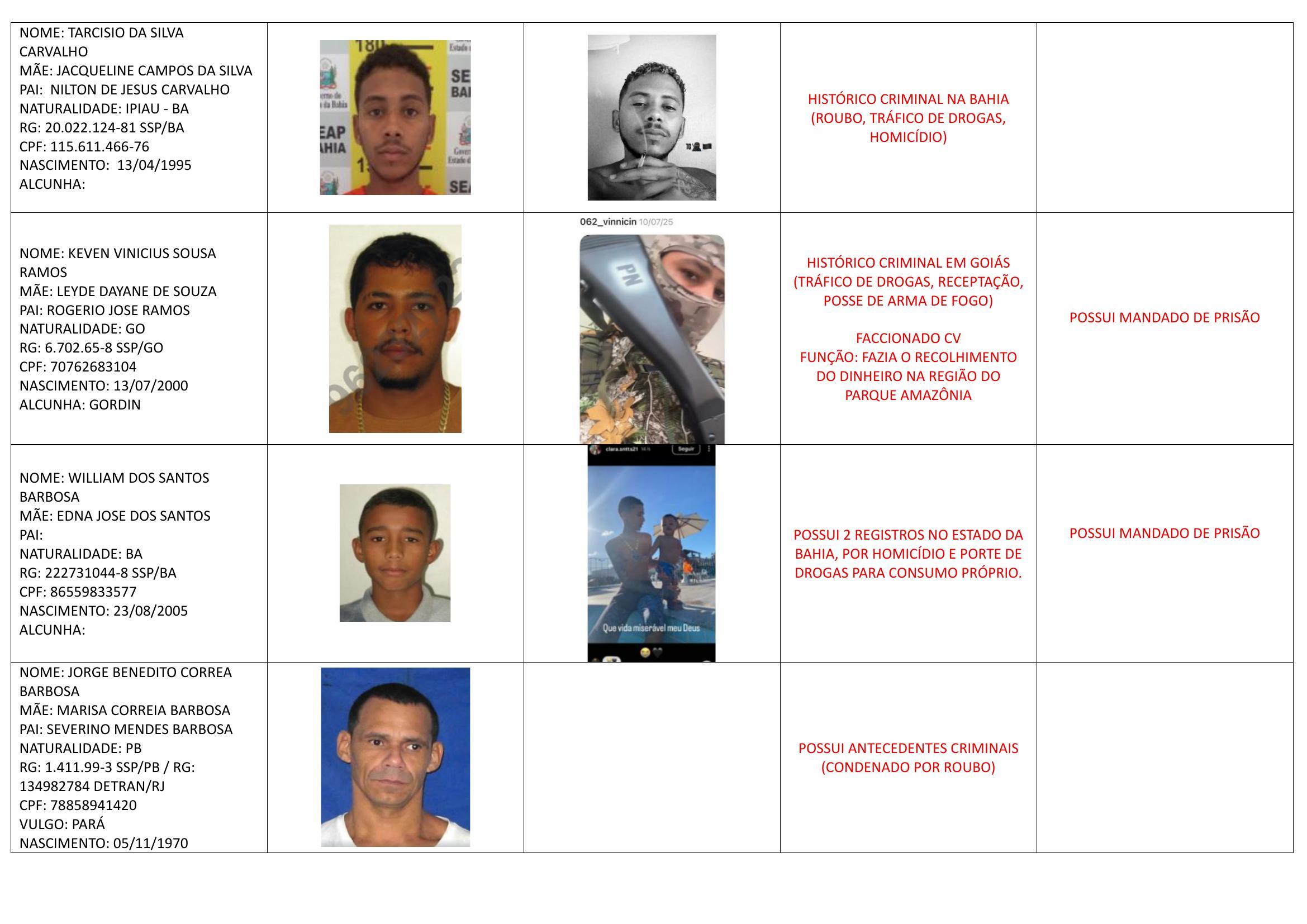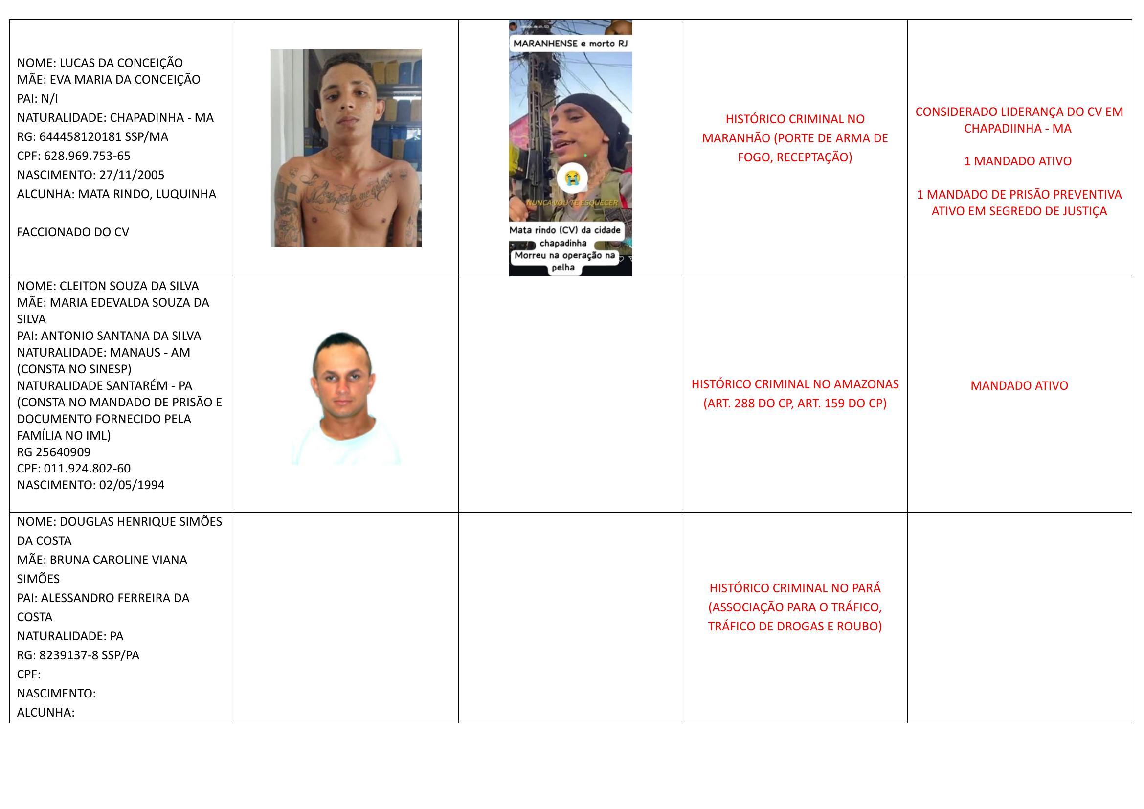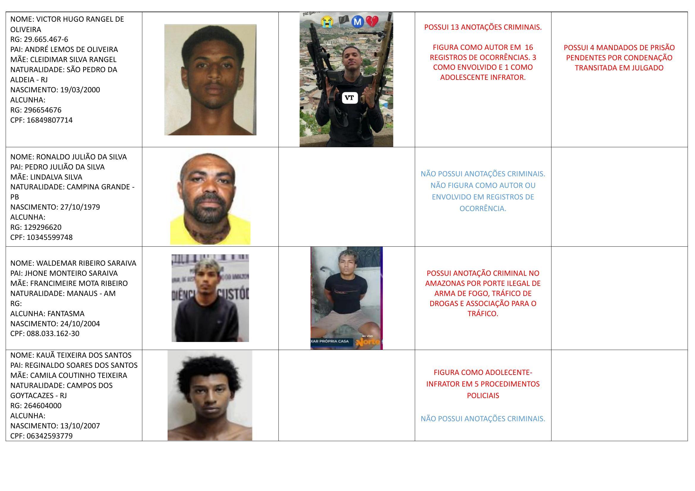 O trabalho de inteligência desenvolvido pela cúpula de Segurança Pública do estado identificou que 59 tinham mandados de prisão pendentes, pelo menos 97 apresentavam históricos criminais relevantes e, dos 17 que não apresentaram histórico criminal, 12 apresentaram indícios de participação no tráfico em suas redes sociais. A lista mostra, ainda, que 62 neutralizados são naturais de outros estados – mais da metade. Até o momento, 19 do Pará, 9 do Amazonas, 12 da Bahia, 4 do Ceará, 2 da Paraíba, 1 do Maranhão, 9 de Goiás, 1 do Mato Grosso, 3 do Espírito Santo, 1 de São Paulo e 1 do Distrito Federal. O relatório indica que, no Rio de Janeiro, há chefes de organizações criminosas de 11 estados da federação, de quatro das cinco regiões do país.