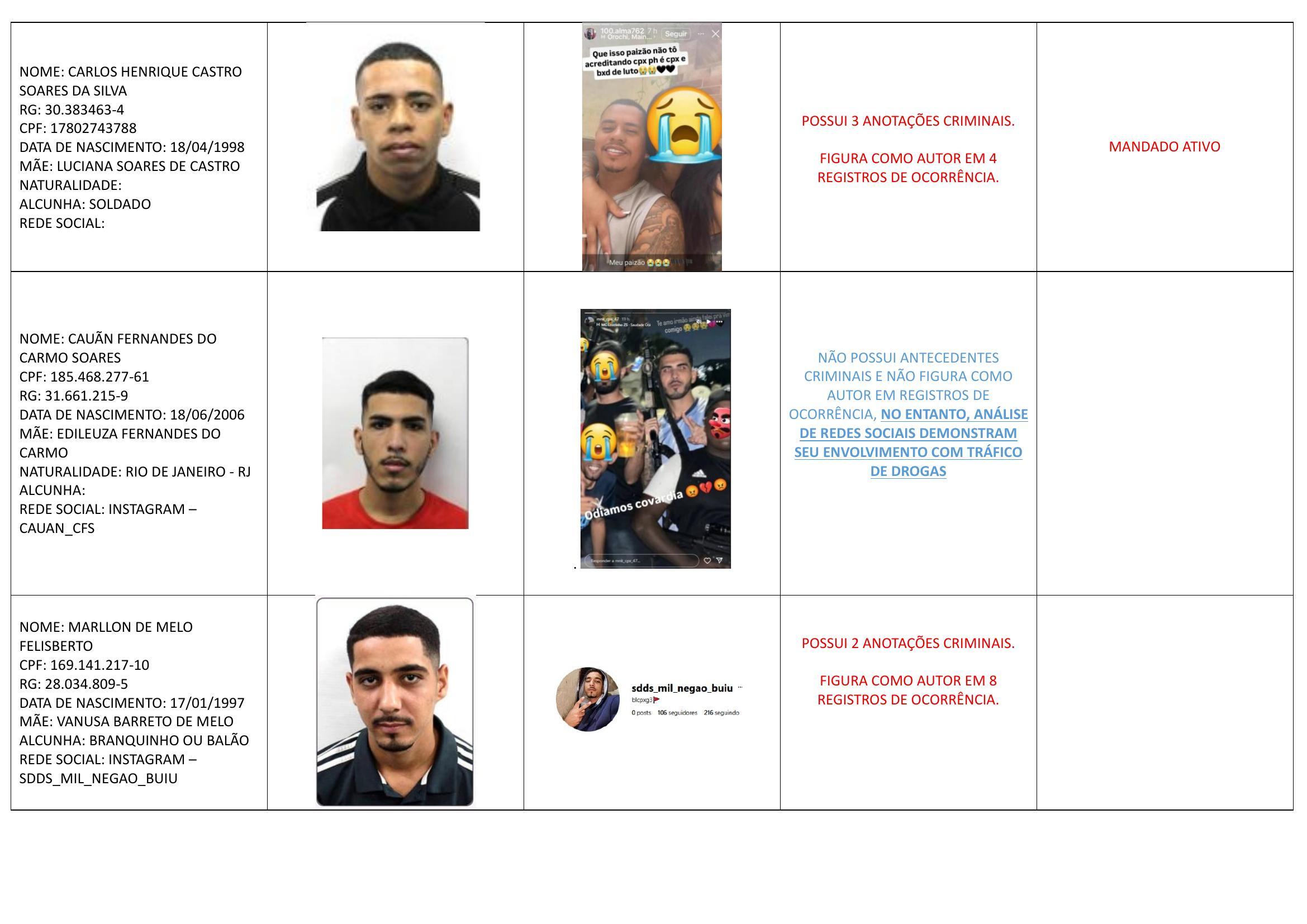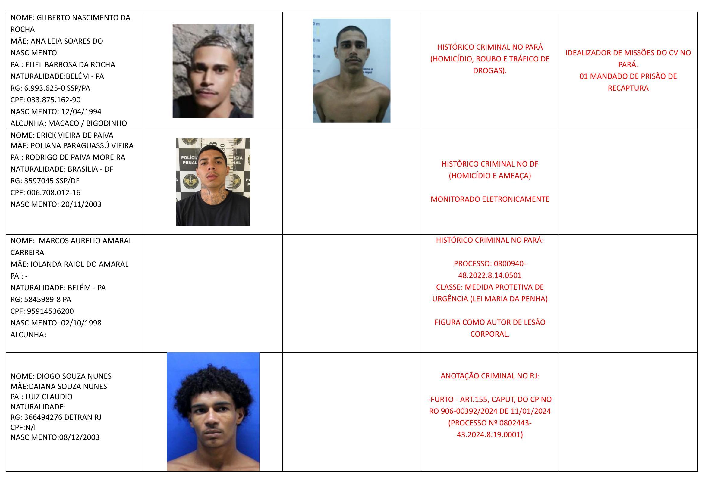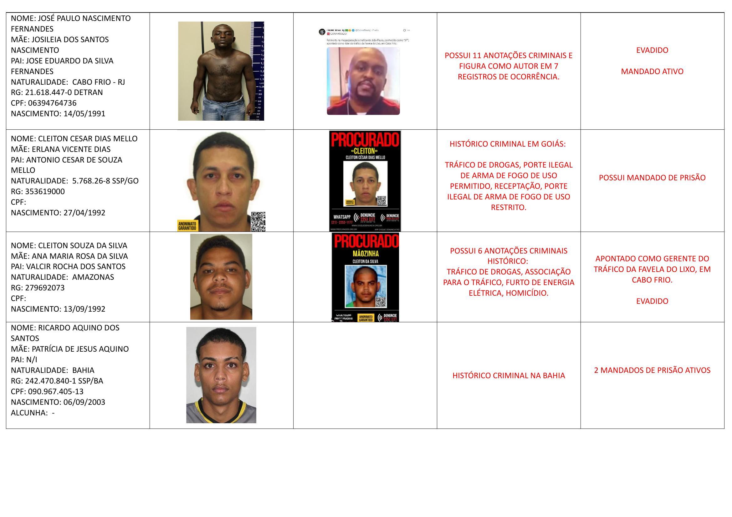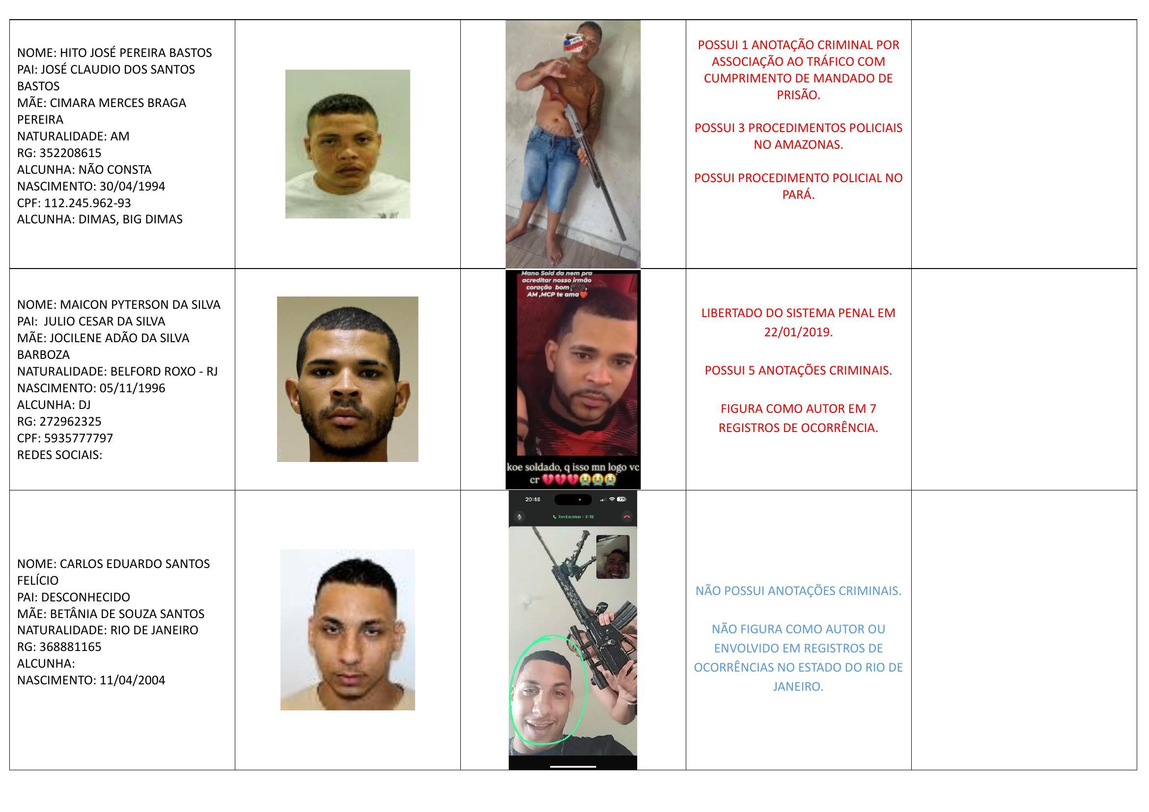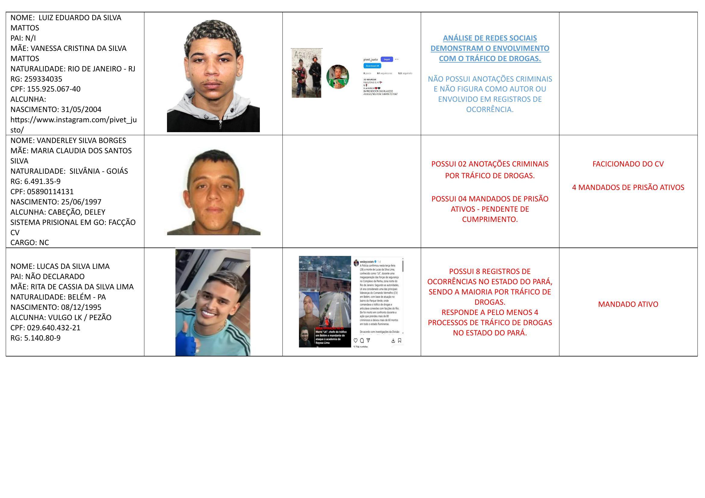 O trabalho de inteligência desenvolvido pela cúpula de Segurança Pública do estado identificou que 59 tinham mandados de prisão pendentes, pelo menos 97 apresentavam históricos criminais relevantes e, dos 17 que não apresentaram histórico criminal, 12 apresentaram indícios de participação no tráfico em suas redes sociais. A lista mostra, ainda, que 62 neutralizados são naturais de outros estados – mais da metade. Até o momento, 19 do Pará, 9 do Amazonas, 12 da Bahia, 4 do Ceará, 2 da Paraíba, 1 do Maranhão, 9 de Goiás, 1 do Mato Grosso, 3 do Espírito Santo, 1 de São Paulo e 1 do Distrito Federal. O relatório indica que, no Rio de Janeiro, há chefes de organizações criminosas de 11 estados da federação, de quatro das cinco regiões do país.