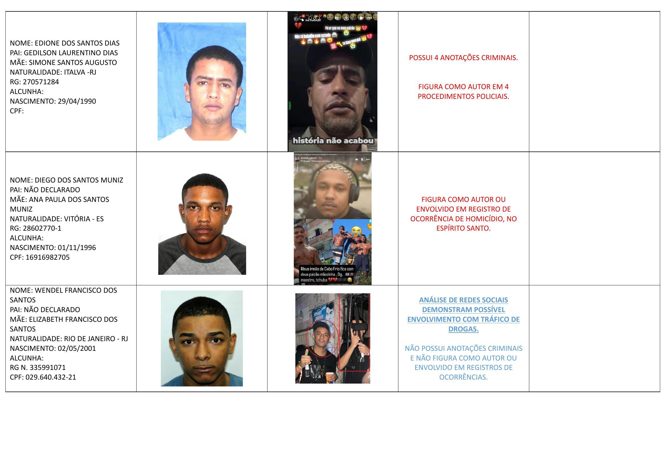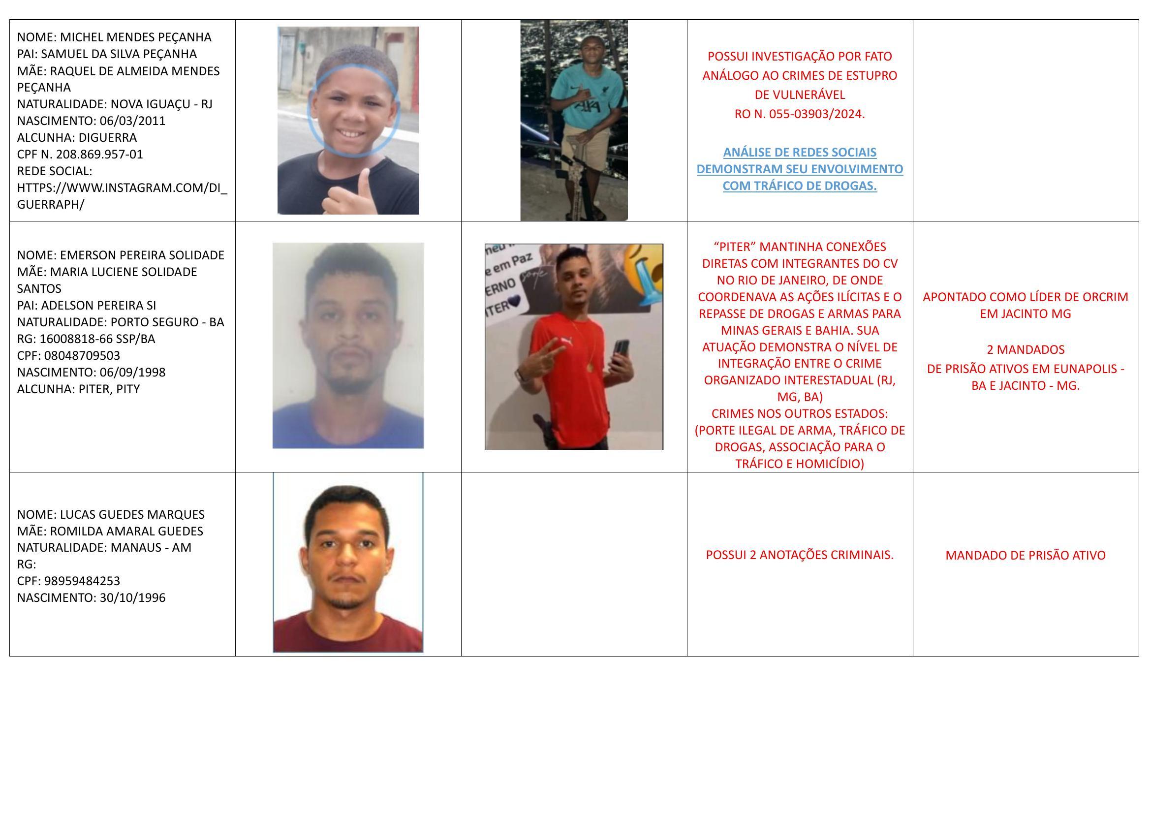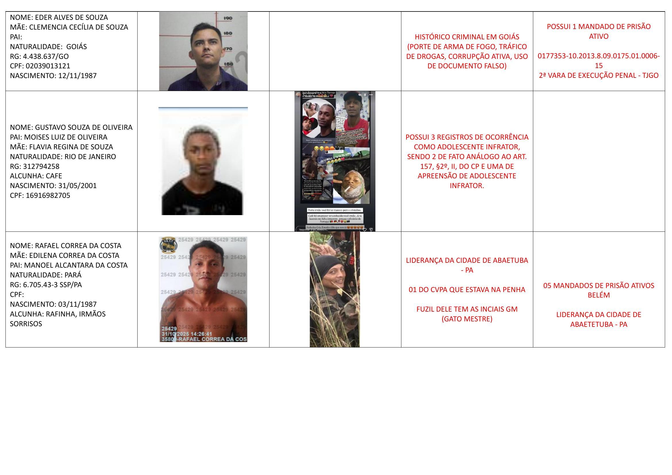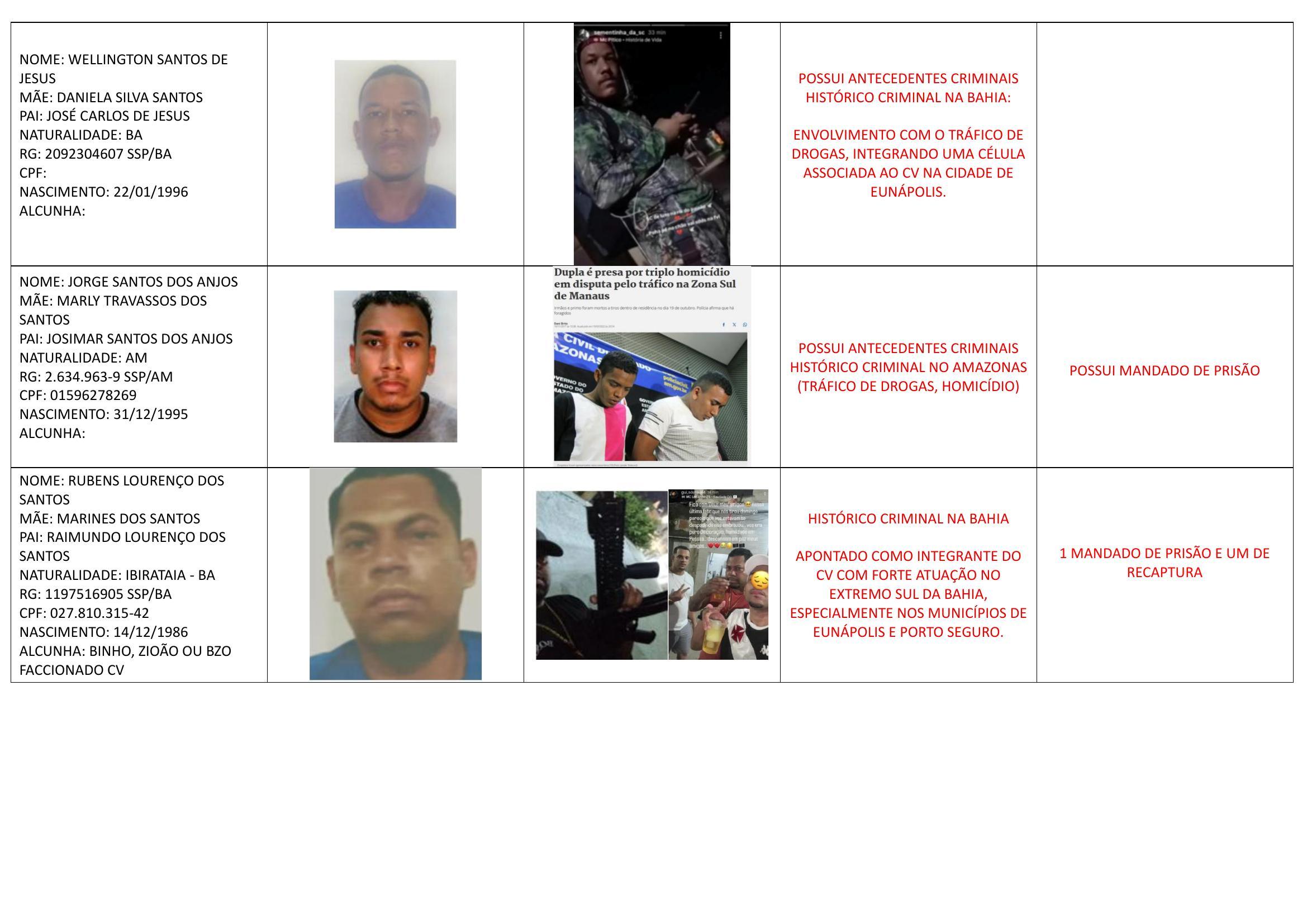 O trabalho de inteligência desenvolvido pela cúpula de Segurança Pública do estado identificou que 59 tinham mandados de prisão pendentes, pelo menos 97 apresentavam históricos criminais relevantes e, dos 17 que não apresentaram histórico criminal, 12 apresentaram indícios de participação no tráfico em suas redes sociais. A lista mostra, ainda, que 62 neutralizados são naturais de outros estados – mais da metade. Até o momento, 19 do Pará, 9 do Amazonas, 12 da Bahia, 4 do Ceará, 2 da Paraíba, 1 do Maranhão, 9 de Goiás, 1 do Mato Grosso, 3 do Espírito Santo, 1 de São Paulo e 1 do Distrito Federal. O relatório indica que, no Rio de Janeiro, há chefes de organizações criminosas de 11 estados da federação, de quatro das cinco regiões do país.