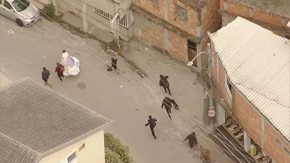 Um grupo foi flagrado correndo na chegada de agentes da Polícia Civil na comunidade Mandela, em Manguinhos, na Zona Norte do Rio de Janeiro, na manhã desta quinta-feira (31). As imagens foram registradas pelo Globocop.
