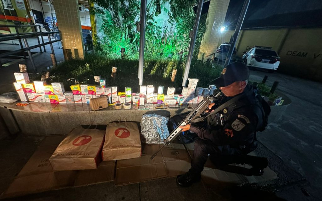 Segundo a corporação, agentes do 20ºBPM (Mesquita) abordaram um veículo na Avenida Plínio Casado, em Nova Iguaçu, na Baixada Fluminense. No interior do carro, os policiais encontraram 100 caixas de medicamentos sem nota fiscal, três celulares e R$ 1.593 em espécie.