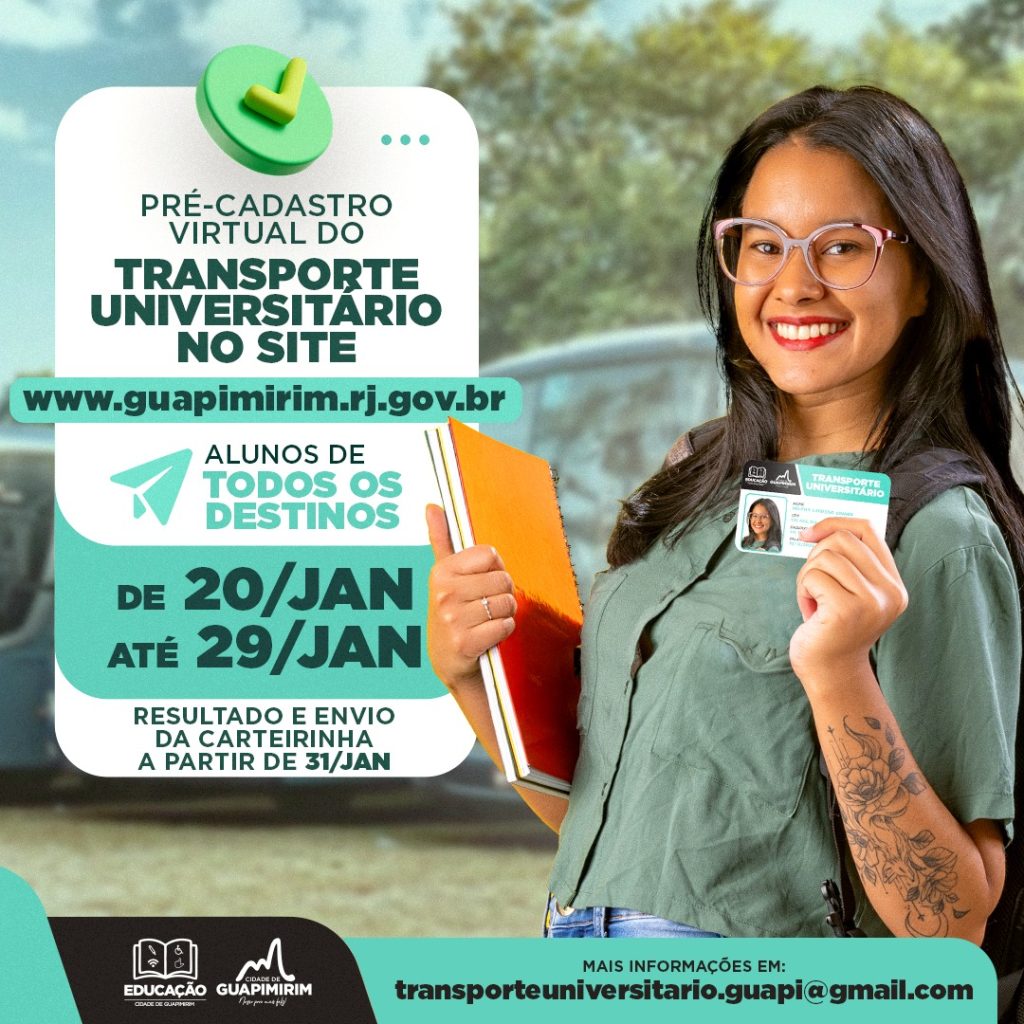 A Prefeitura Municipal de Guapimirim, por meio da Secretaria de Educação, informa que as inscrições para o programa do Ônibus Universitário estarão abertas de 20 a 29 de janeiro. O programa oferece transporte gratuito para estudantes de ensino superior que frequentam instituições em municípios vizinhos, promovendo acesso à educação e apoio aos nossos jovens.