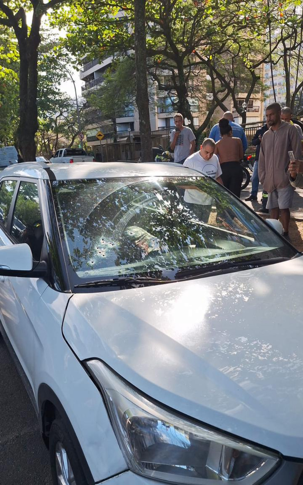Os disparos atingiram principalmente a parte frontal do vidro do motorista. O crime aconteceu em uma região muito movimentada do bairro, em uma rua paralela à Avenida das Américas.