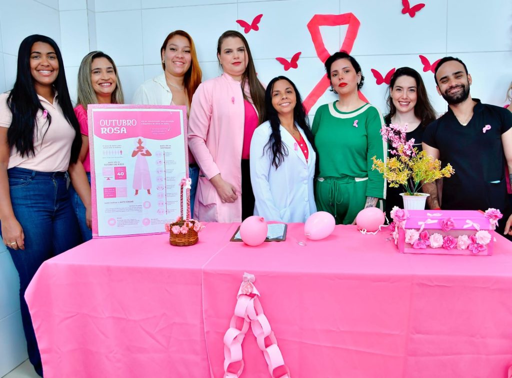 “Importante realizarmos esse trabalho de conscientização junto aos nossos funcionários em um mês tão importante como o Outubro Rosa”, disse a diretora do Hospital Infantil, Gabriela Faustino, ao lado da subdiretora Lívia Marvila; da técnica de enfermagem Miriam Lopes, e outros profissionais de saúde.