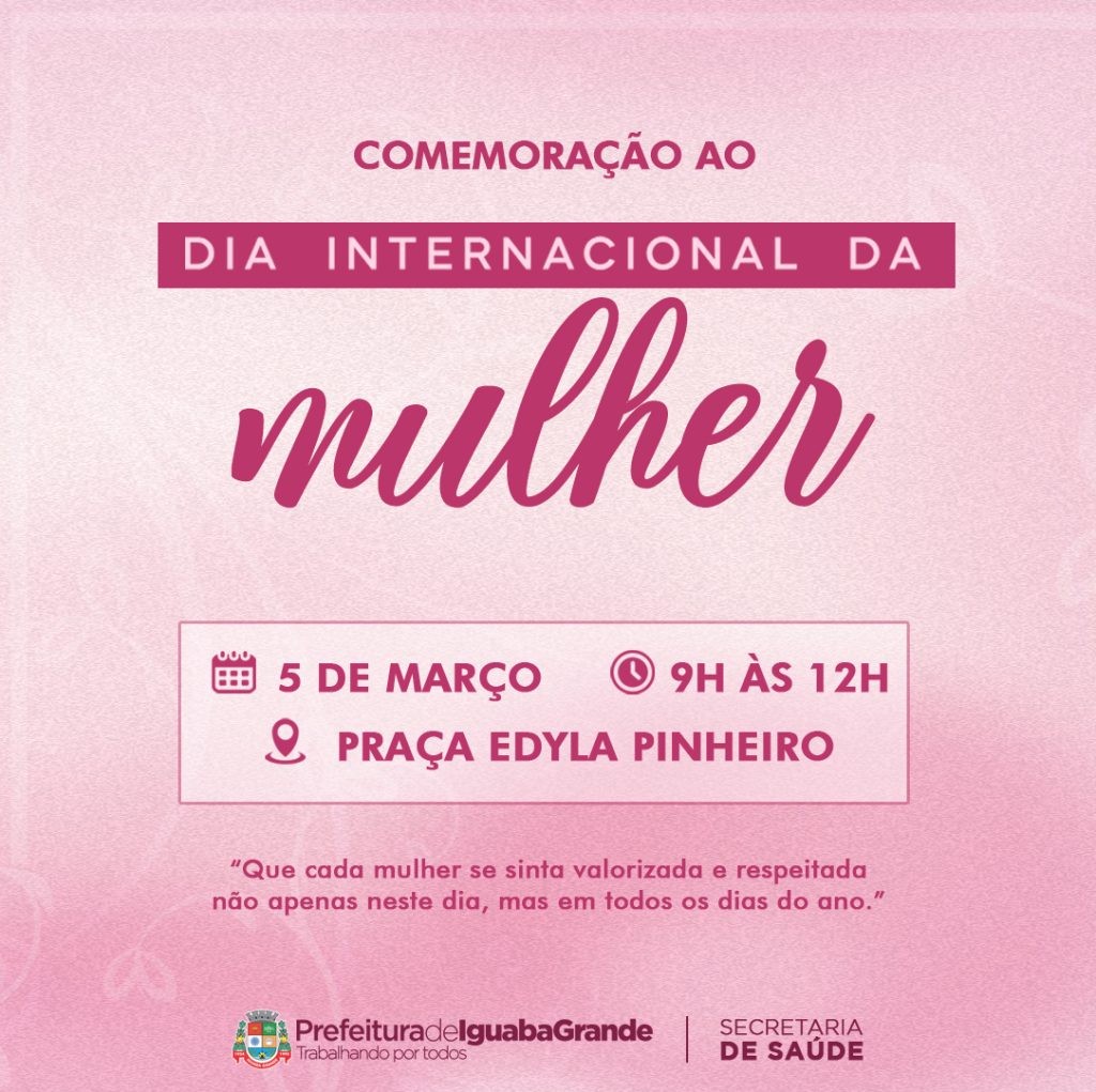 A Prefeitura de Iguaba Grande, por meio da secretaria de Saúde, realizará na próxima terça-feira (05), na Praça Edyla Pinheiro, um grande evento em homenagem ao Dia Internacional da Mulher. As ações serão organizadas pelo Programa de Atenção Integral à Saúde da Mulher, Criança e Adolescente (PAISMCA) e envolverá o trabalho de diversas coordenações, das 9h às 12h.