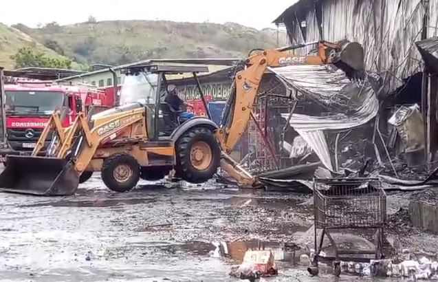 De acordo com os agentes, as chamas teriam começado em um galpão de descartável. Um local de armazenamento de arroz e milho também foi destruído.