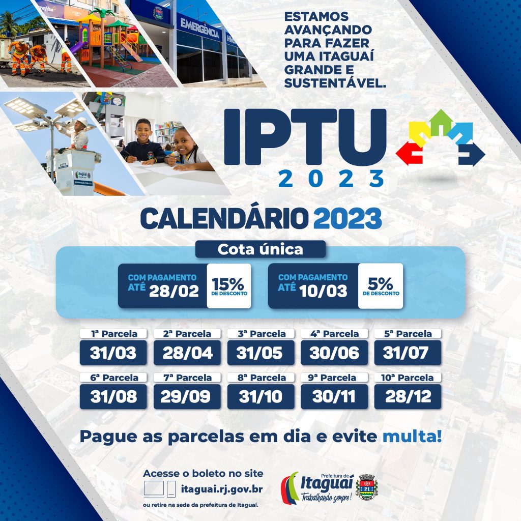 A Prefeitura de Itaguaí está oferecendo desconto de 15% para os contribuintes que optarem por antecipar o pagamento em cota única do Imposto Sobre a Propriedade Predial e Territorial Urbana (IPTU) de 2023. O desconto será de 15%, caso o contribuinte efetuar o pagamento até 28/02, e de 5% caso o tributo seja quitado até 10/03. A Secretaria de Fazenda lembra que também há outra forma de pagamento: quem preferir, pode fazer o parcelamento em até 10 vezes, devendo solicitá-lo a partir de março. Neste caso, não há benefício de desconto.
