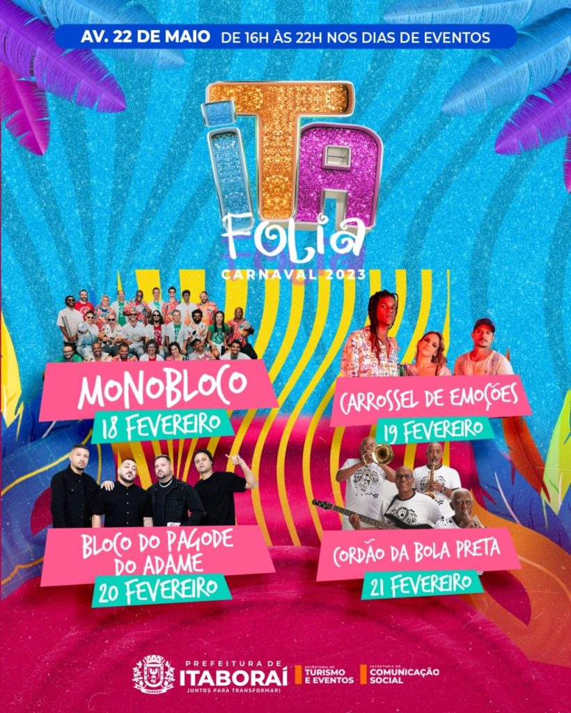 O carnaval 2023 em Itaboraí promete arrastar uma multidão de foliões pelas ruas da cidade, durante os dias 18 e 21 de fevereiro. O Ita Folia contará com grandes blocos carnavalescos, como Monobloco, Cordão da Bola Preta, Carrossel de Emoções e o Bloco do Pagode do Adame. A programação de shows será concentrada na Avenida 22 de Maio, na altura do Centro, das 16h às 22h. E simultaneamente, a Praça Marechal Floriano Peixoto será palco da ‘matinê’ reservada para os pequenos foliões.