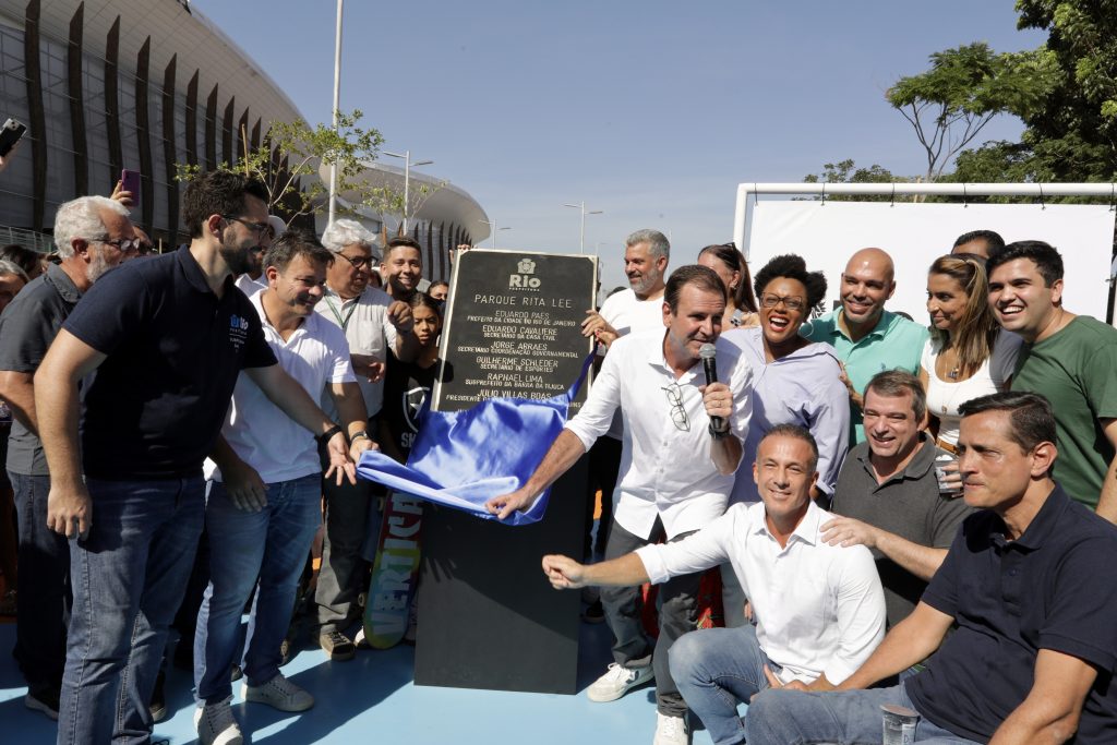 O prefeito Eduardo Paes inaugurou, neste domingo (12/5), um novo espaço de lazer e práticas esportivas na cidade: o Parque Rita Lee, localizado em uma parte do Parque Olímpico, na Barra da Tijuca. A área total é de 136 mil m² e oferece aos cariocas praça molhada, skate park, muro de escalada com 120 m², quadras poliesportivas, área com brinquedos para crianças, bosque com 200 árvores, entre outas novidades. O novo parque fica numa rota que conecta todas as principais áreas do Parque Olímpico, como as arenas, os terraços e o “Live Site”, uma esplanada destinada a eventos em frente à Lagoa de Jacarepaguá, na Zona Oeste.