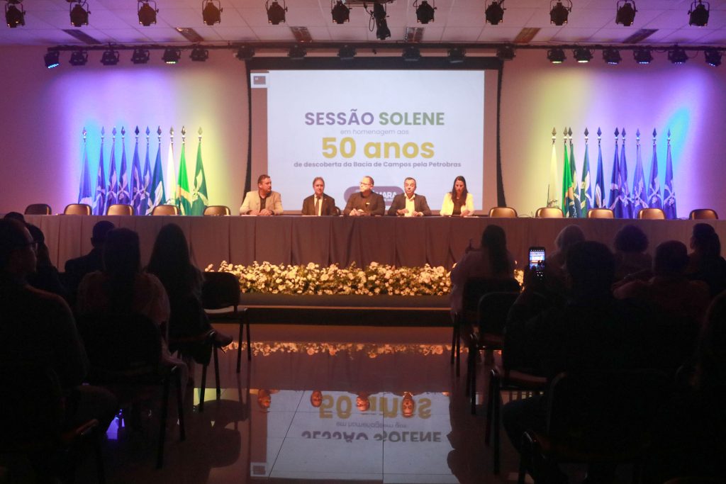 A Câmara Municipal de Macaé realizou, nesta segunda-feira (18), sessão solene para homenagear os 50 anos da descoberta de petróleo na Bacia de Campos pela Petrobras. O evento reuniu autoridades e representantes da companhia, que destacaram os avanços ao longo das cinco décadas de atuação na região que é responsável por mais de 80% da produção de óleo e gás do Brasil.