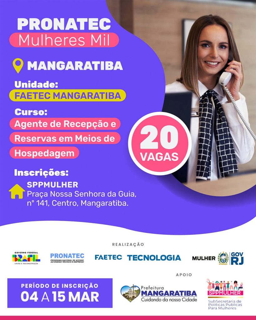 A realização do programa é uma parceria da FAETEC, da Secretaria de Estado da Mulher e da Prefeitura de Mangaratiba, através da Subsecretaria de Políticas Públicas para as Mulheres (SPPMULHER).