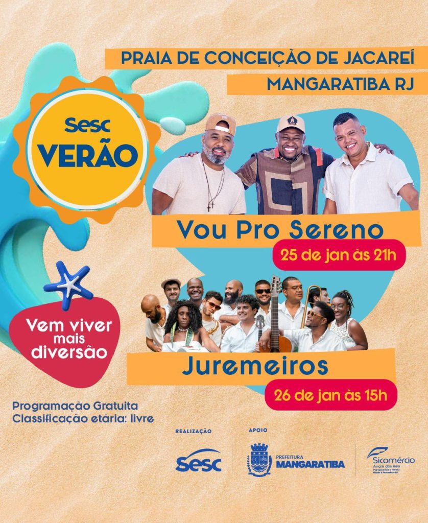 No próximo fim de semana, mais uma edição do Sesc Verão vai estacionar na praia de Conceição de Jacareí. A programação diversa vai levar apresentações, atividades esportivas e muita diversão para os moradores de Mangaratiba. O evento acontece nos dias 25 e 26/01, a partir de 9h, e vai contar com shows de Vou pro Sereno e Juremeiros. A realização é do Sesc Rio com apoio da Prefeitura de Mangaratiba.