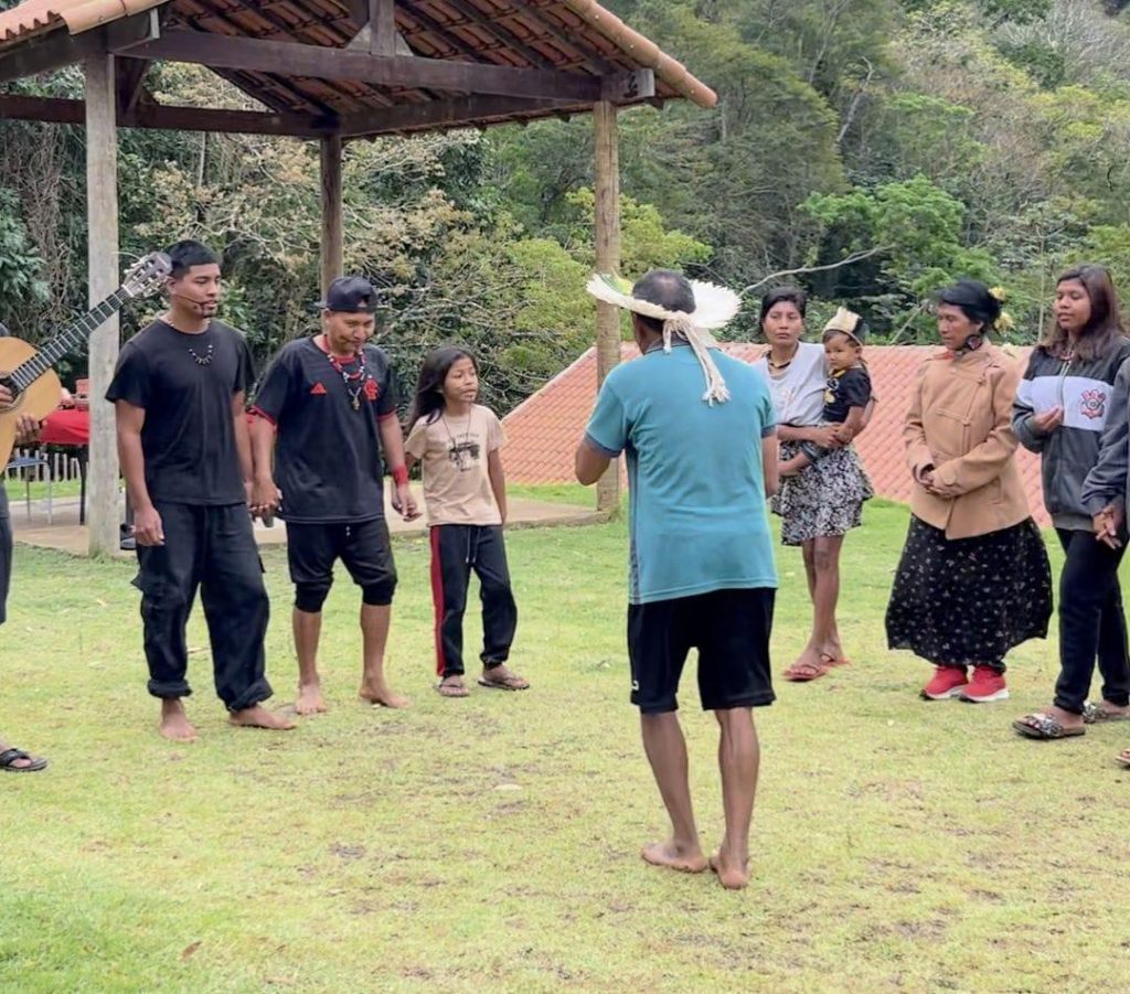 Os visitantes são alunos do Curso de Direitos Indígenas em trabalho de campo para estudos do meio indígena. Eles assistiram uma apresentação do coral Guarani, conheceram os espaços da aldeia e participaram de uma roda de conversa sobre cultura e saberes do povo Guarani.