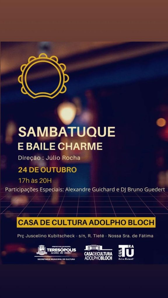 Nesta sexta-feira, dia 24, o samba e o charme se encontram no evento ‘Sambatuque e Baile Charme’, que promete agitar a Casa de Cultura Adolpho Bloch, das 17h às 20h, sob a direção do professor, coreógrafo e percussionista, Júlio Rocha.