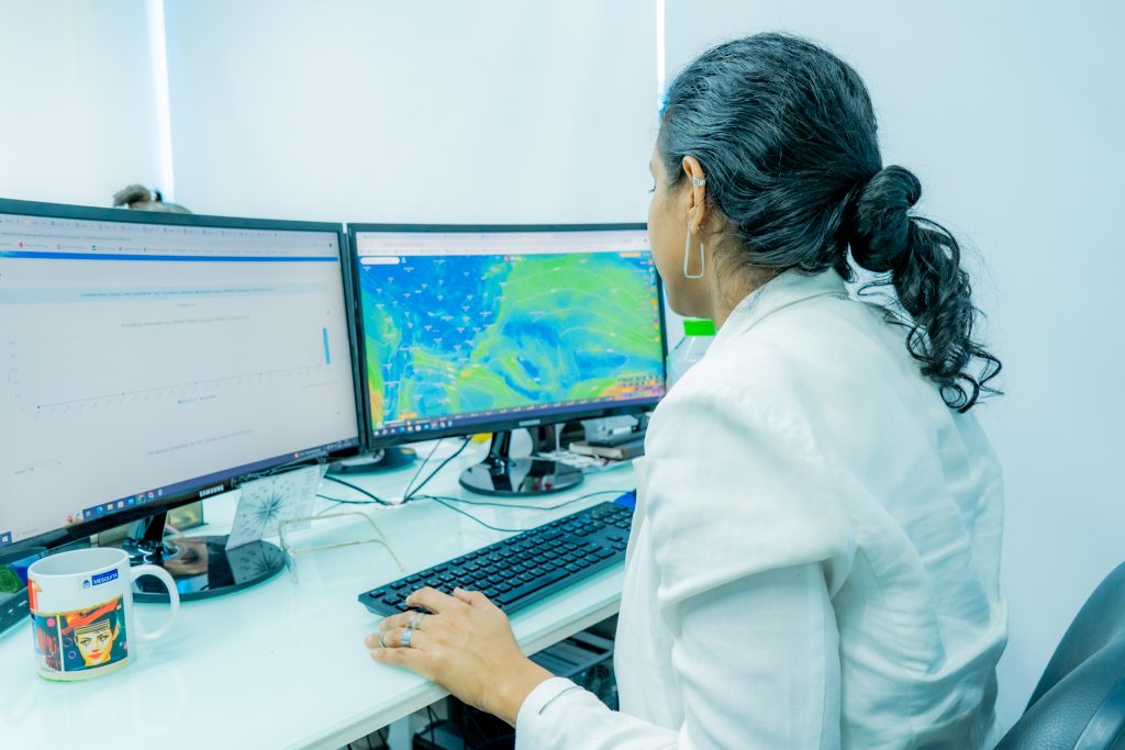 Atualmente, quem comanda o setor no CCO é a meteorologista Christiane Nascimento, que também é mestre em Engenharia de Biossistemas e tecnóloga em Gestão Ambiental. No seu dia a dia, a profissional realiza a análise atmosférica de forma frequente para estabelecer a previsão do tempo apenas para o município de Mesquita. A partir disso, ela consegue conceber dados indicadores sobre a performance climática esperada em um período de quatro em quatro em dias, que é divulgada na aba “Meteorologia – Previsão do Tempo”, dentro do próprio site e nas redes sociais do Centro de Controle Operacional. Para isso, Christiane faz uso de sistemas e portais de meteorologia a fim de obter informações sobre temperatura, vento, chuva, pressão atmosférica e radiação solar.