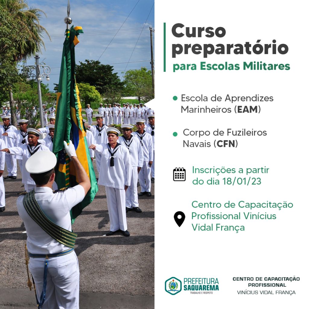 A Prefeitura de Saquarema, por meio da Secretaria Municipal de Educação, Cultura, Inclusão, Ciência e Tecnologia, está oferecendo Cursos Preparatórios gratuitos para as Escolas Militares a fim de capacitar jovens e adultos da cidade para o mercado de trabalho. O período de inscrições começa nesta quarta-feira, 18 de janeiro e segue até o dia 20. As aulas começam na segunda-feira, 23, nos turnos da tarde e noite.