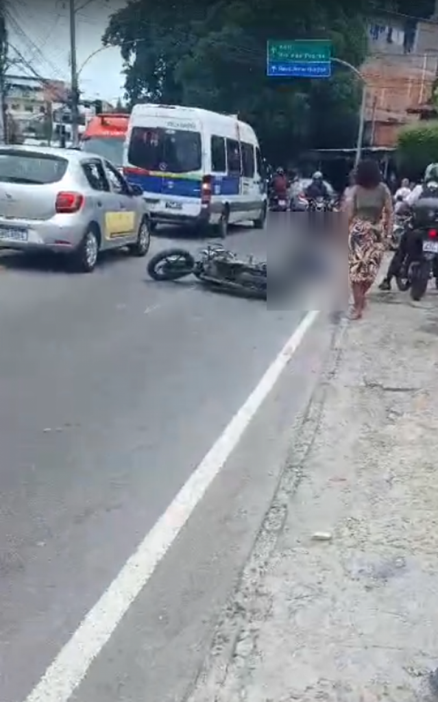 Em imagens que circulam nas redes sociais, é possível ver o homem caído no chão, com a moto ao lado e diversos populares ao redor.