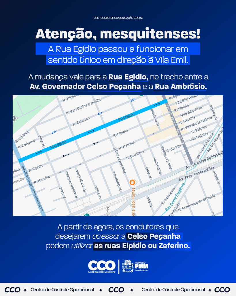 Alerta para os motoristas e pedestres: desde o último dia 3 de junho, a Rua Egídio funciona em sentido único em direção à Vila Emil. A mudança vale para o trecho entre a Avenida Governador Celso Peçanha e a Rua Ambrósio. Com isso, os condutores que desejarem acessar a Celso Peçanha podem utilizar as ruas Elpídio ou Zeferino. A alteração faz parte de um projeto de melhorias do trânsito no bairro, com o objetivo de promover ainda mais fluidez e segurança nas vias públicas.