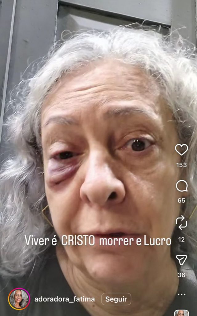 Fátima Candeias, de 62 anos, foi agredida com um soco no olho na tarde de quinta-feira (16), enquanto cantava louvores em frente a um supermercado no bairro do Catete, na Zona Sul. O agressor não foi identificado.