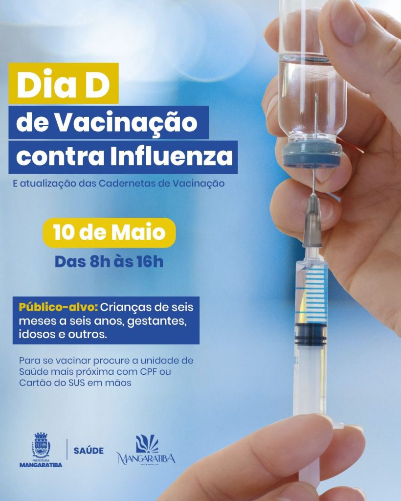 Neste sábado, dia 10/05, das 8h às 16h, tem Dia D de Vacinação contra Influenza em Mangaratiba. Ao todo, nove unidades de saúde estarão abertas para vacinar a população contra a Gripe, e também atualizar Cadernetas de Vacinação.