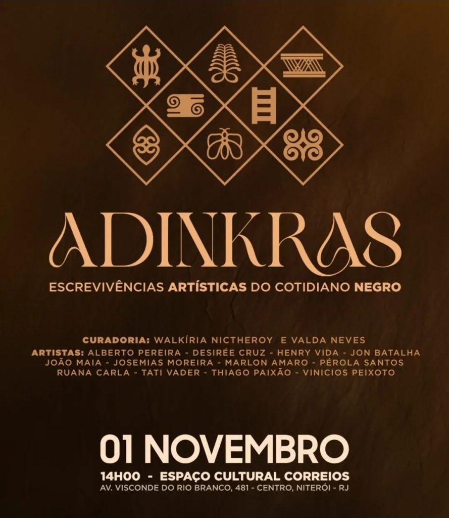 No sábado, o Centro Cultural dos Correios contará com a exposição “Adinkras – Escrevivências artísticas do cotidiano negro”, que reúne 12 jovens artistas da cidade de Niterói no Espaço Cultural dos Correios para falar sobre vivência, ancestralidade e futuro.