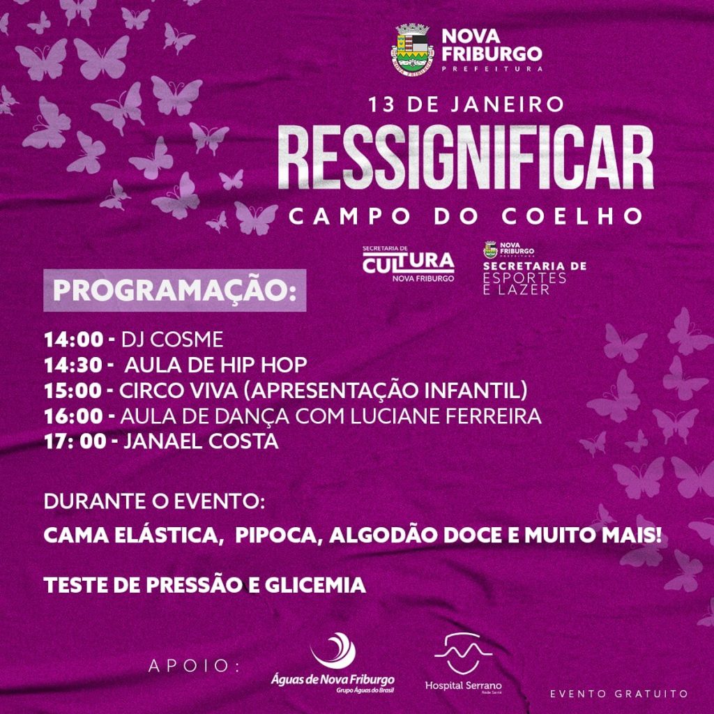 No sábado, dia 13 de janeiro, a Prefeitura de Nova Friburgo, através das Secretarias Municipais de Cultura e de Esportes e Lazer, realizará a ação simbólica ”Ressignificar”, no campo de futebol de Campo do Coelho, em alusão a tragédia climática que ocorreu no município e na região serrana de 2011. Essa é a segunda edição do evento, que foi realizado no último ano no Terra Nova.