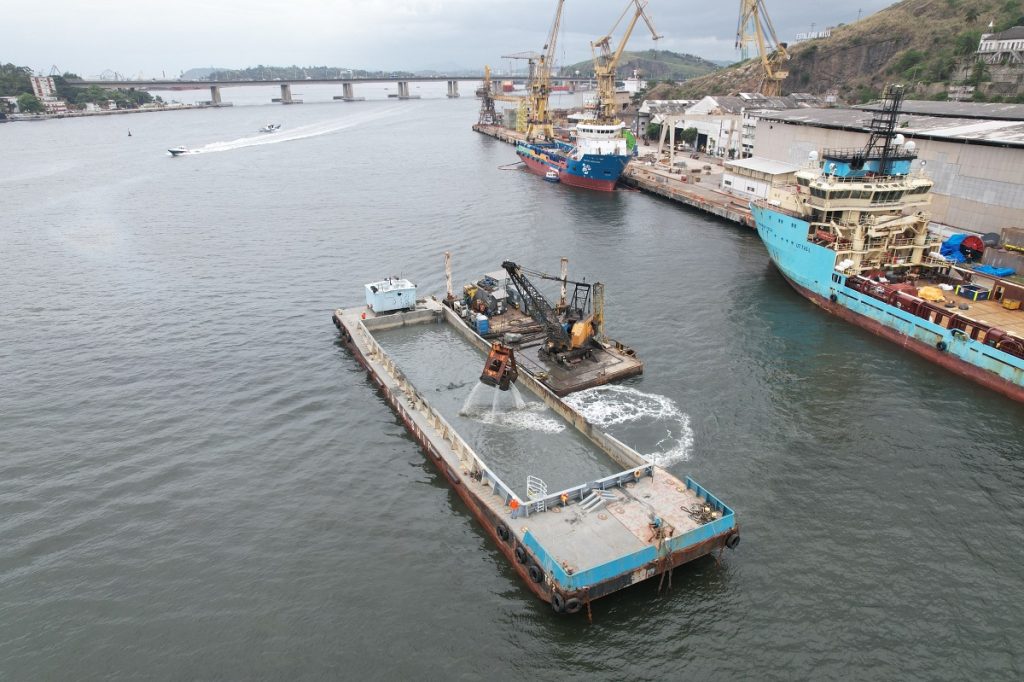 Nesta fase, três equipamentos realizam a dragagem de material no espaço próximo às ilhas de Santa Cruz, Conceição e Mocanguê.