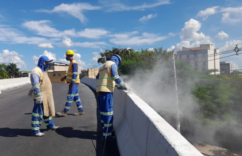 No bairro Voldac, a construção do viaduto próximo ao batalhão da Polícia Militar segue nos ajustes finais, com as equipes realizando o tratamento da superfície de concreto para melhorar o acabamento e iniciando corte no asfalto para execução das juntas de dilatação.