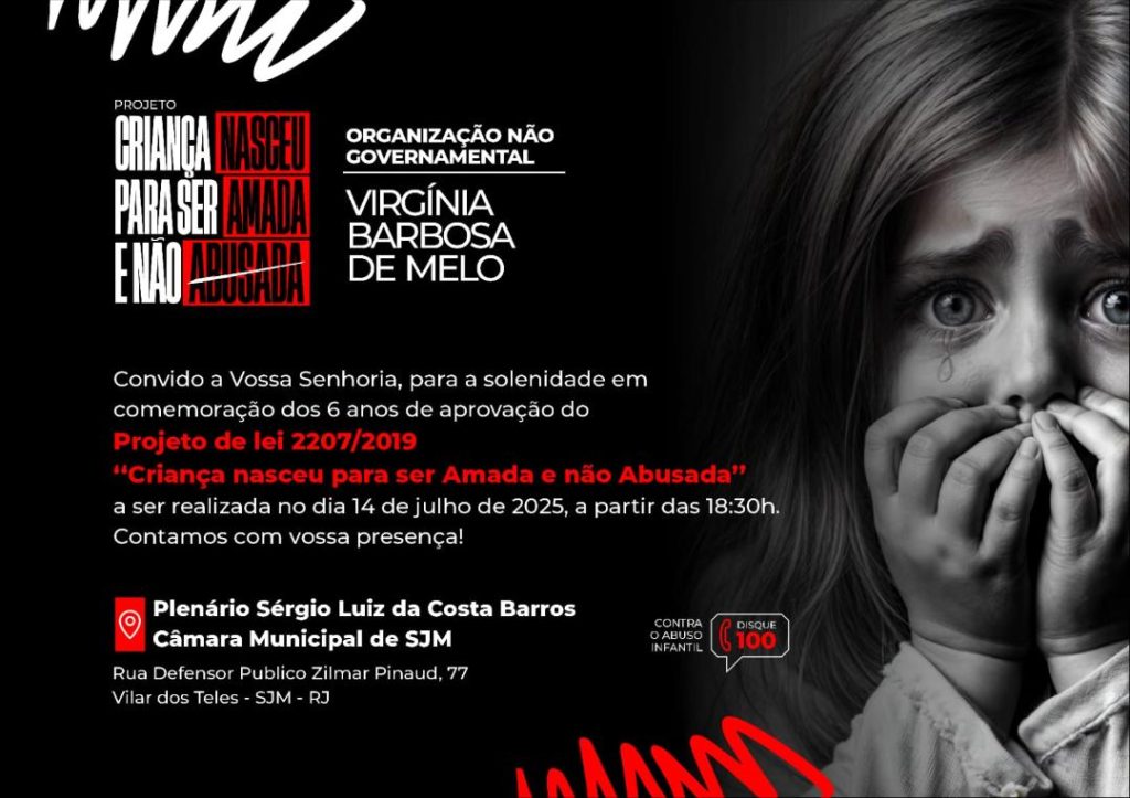 Intensificar as orientações à população sobre casos recentes de abusos sexuais contra crianças e adolescentes. Este é um dos objetivos do projeto “Criança nasceu para ser amada e não abusada”, criado pela Organização Não Governamental Virgínia Barbosa de Melo, de São João de Meriti, na Baixada Fluminense. O projeto será lançado no dia 14 de julho, a partir das 18h30, em solenidade na Câmara Municipal, com a presença de representantes do judiciário, legislativo, executivo, ongs e instituições de proteção à criança e adolescente.