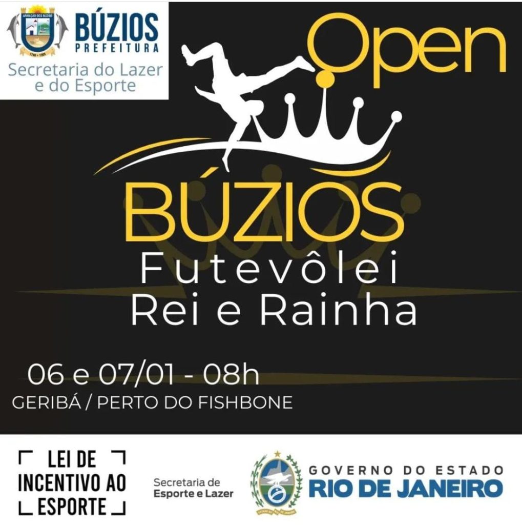 A Prefeitura de Búzios, por meio da Secretaria de Lazer e do Esporte, vai realizar neste sábado (6) e domingo (7), em Geribá, em frente ao Fishbone, o Open Búzios Rei e Rainha de Futevôlei a partir das 8h. O evento conta com apoio da Secretaria Estadual de Esporte e Lazer.