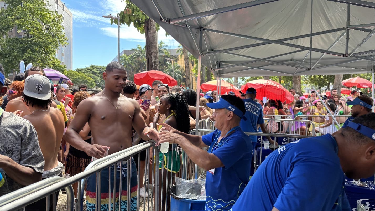 Mais de 50 mil litros de água devem ser distribuídos. Chuveirinhos e Superbebedourorefrescam os foliões A Defesa Civil Estadual informa: a temperatura