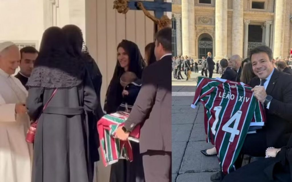 O papa Leão XIV foi presenteado com uma camisa do Fluminense nesta sexta-feira (14), no Vaticano. O uniforme tricolor trazia o nome do pontífice e o número 14 nas costas.