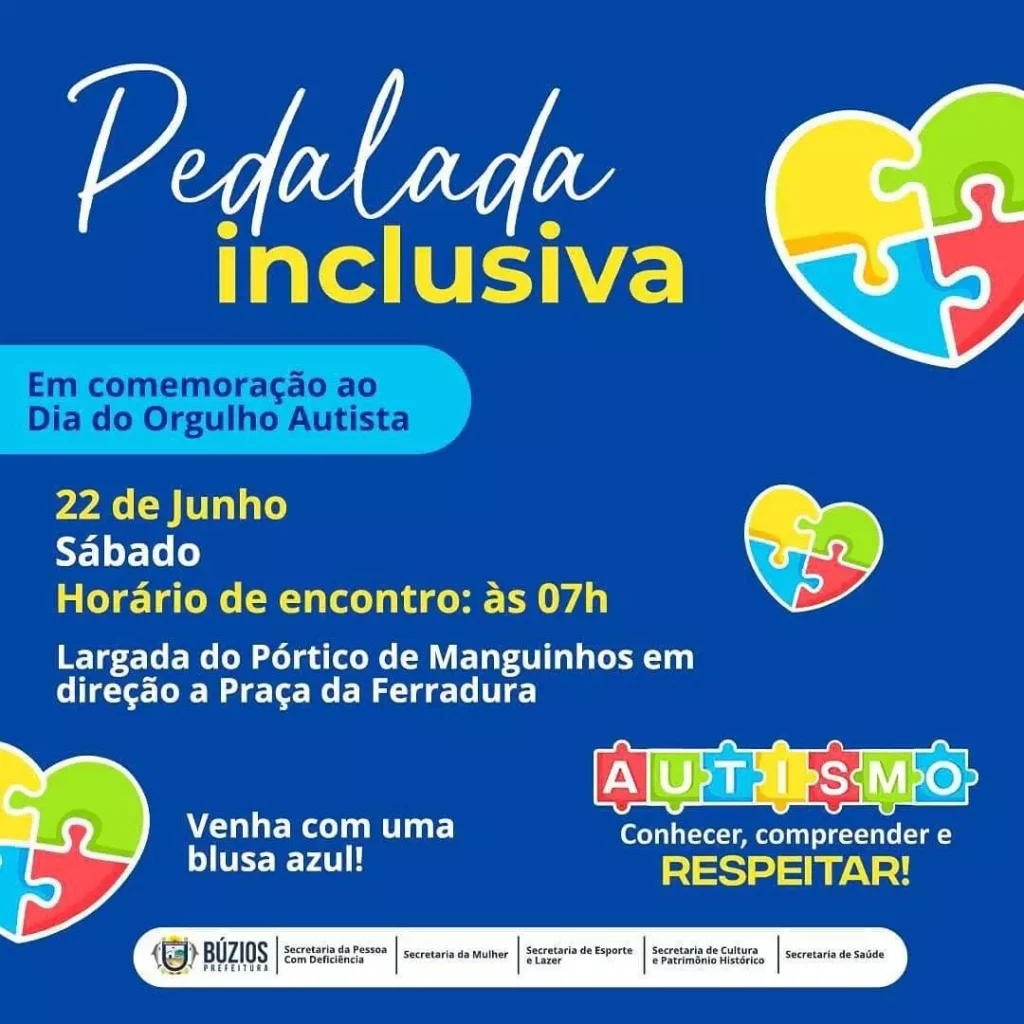 Em comemoração ao “Dia do Orgulho Autista”, celebrado no dia 18 de junho, a Prefeitura de Búzios, por meio da Secretaria da Pessoa com Deficiência, realizará neste sábado (22), uma Pedalada Inclusiva, na Avenida José Bento Ribeiro Dantas, entre o Centro de Informação Turística (Pórtico) e a Praça da Ferradura, a partir das 7h.