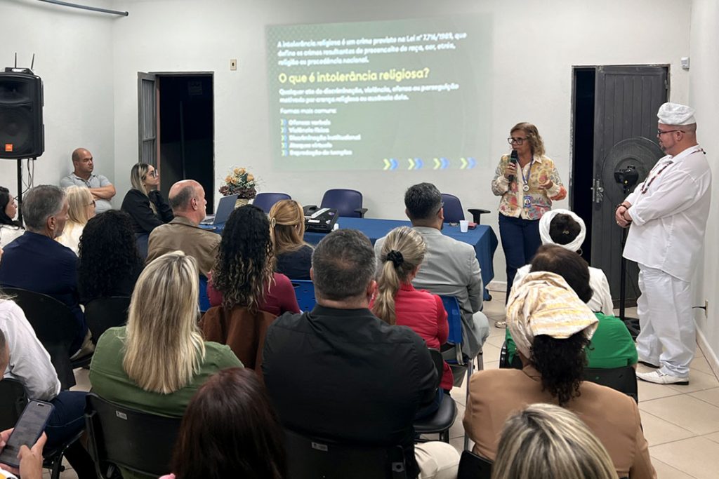 Durante a palestra, o assessor da Secretaria, Ramon Medeiros, ressaltou a importância histórica da legislação de combate à intolerância religiosa. “É importante lembrar que a lei criada em 2007 nasceu após muitos anos de preconceito e luta. Ela surge da mobilização de pessoas que buscaram reconhecimento e respeito, diante de uma realidade em que a intolerância gerou dor e exclusão. Precisamos reforçar que a intolerância é um mal coletivo”, destacou.