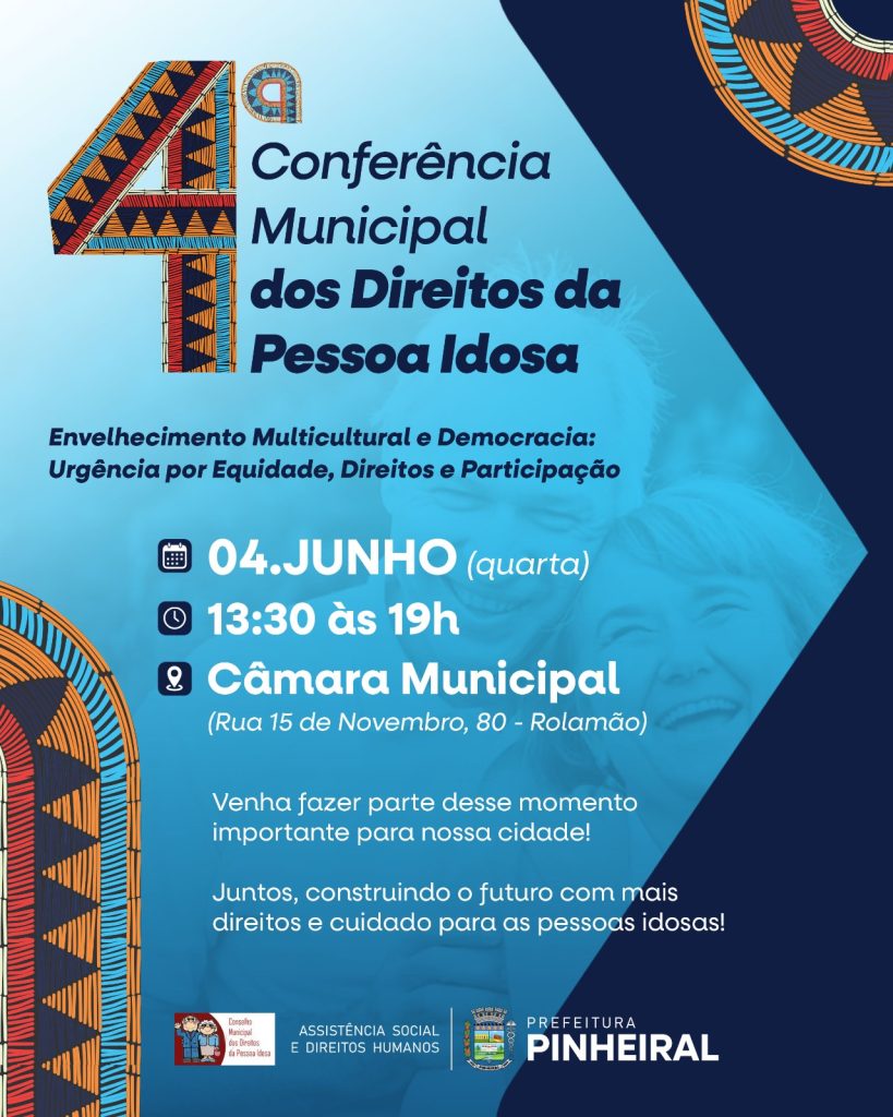 O Conselho Municipal dos Direitos da Pessoa Idosa e a Prefeitura de Pinheiral, por meio da Secretaria de Assistência Social e Direitos Humanos, realizam no dia 4 de junho (quarta-feira) a 4ª Conferência Municipal dos Direitos da Pessoa Idosa, com o tema “Envelhecimento Multicultural e Democracia: Urgência por Equidade, Direitos e Participação”.