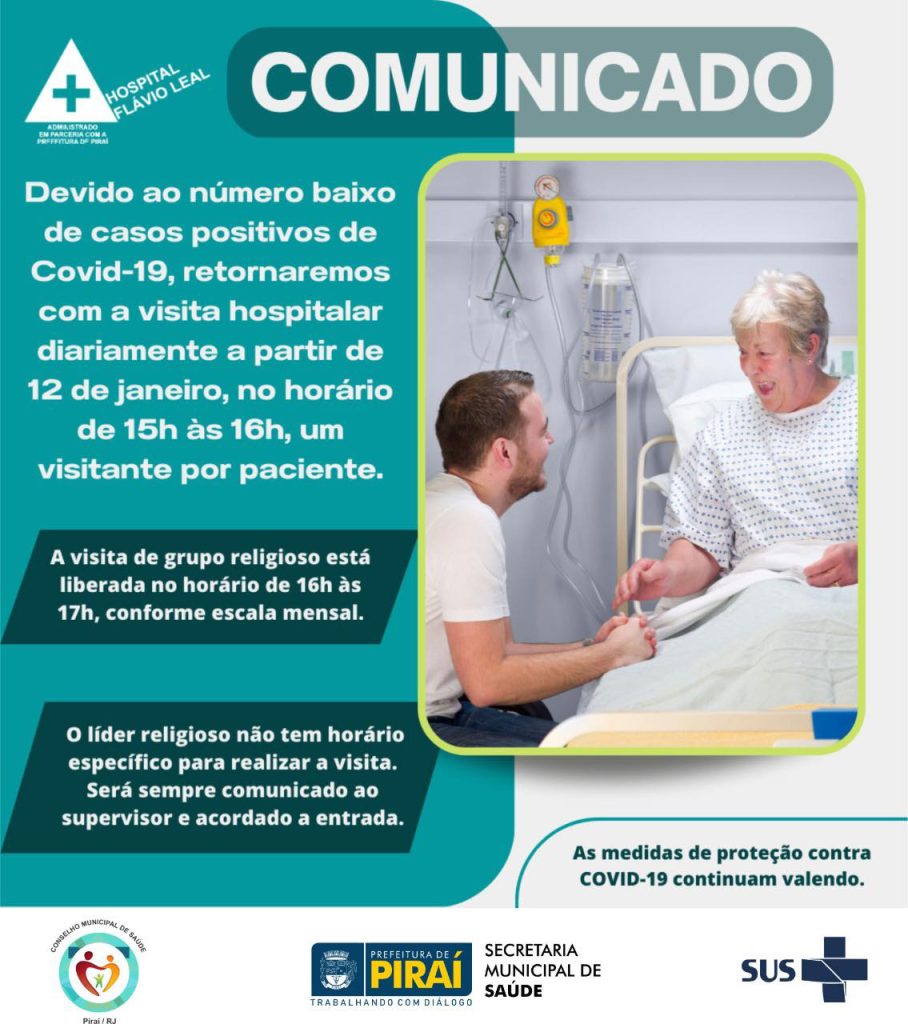 A Prefeitura de Piraí, através da Secretaria Municipal de Saúde e do Hospital Flávio Leal, comunica a retomada da visita hospitalar a partir desta quinta-feira, dia 12 de janeiro de 2023. As medidas de proteção contra a Covid-19 continuam valendo no município