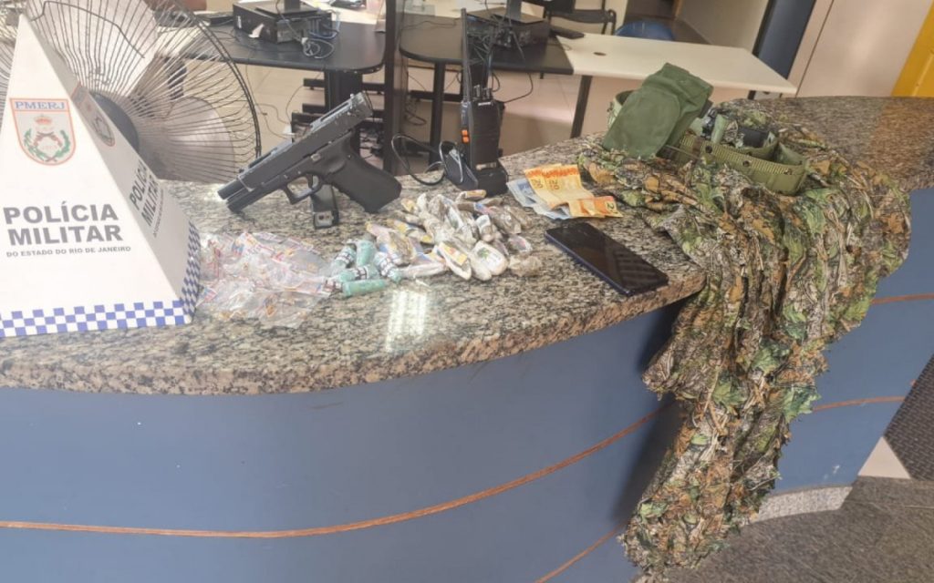 De acordo com o corporação, o trio estava com uma arma falsa, uma base de rádio transmissor, um celular e um traje camuflado.