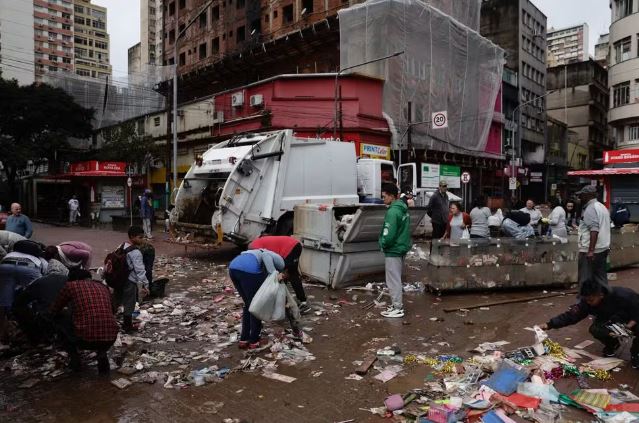 As equipes de limpeza recolhem móveis e estruturas que haviam sido danificadas pela enchente no início do mês e haviam sido descartadas nas calçadas.