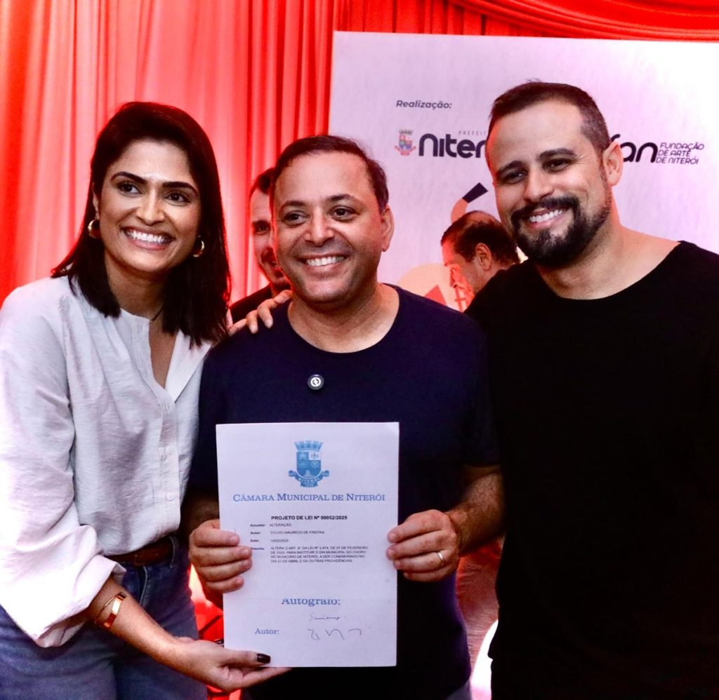 Ao lado da cantora Leila Pinheiro, que havia terminado um show, o prefeito sancionou a nova lei no Reserva Cultural, um dos locais de apresentações do III Festival Internacional de Choro de Niterói, que começou na quarta-feira (23) e termina neste domingo (27). O projeto de lei 00052/2025 é de autoria do vereador Sylvio Maurício de Freitas. O vereador esteve presente no evento, assim como a presidente da Fundação de Arte de Niterói (FAN), Micaela Costa, e o secretário de Economia Criativa e Ações Estratégicas, André Diniz.