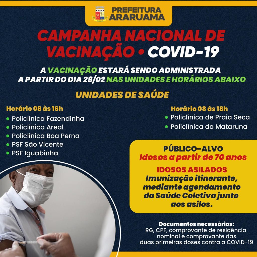 Prefeitura de Araruama vacina idosos a partir de 70 anos e também os que vivem em asilos com a dose reforço da vacina contra a COVID-19