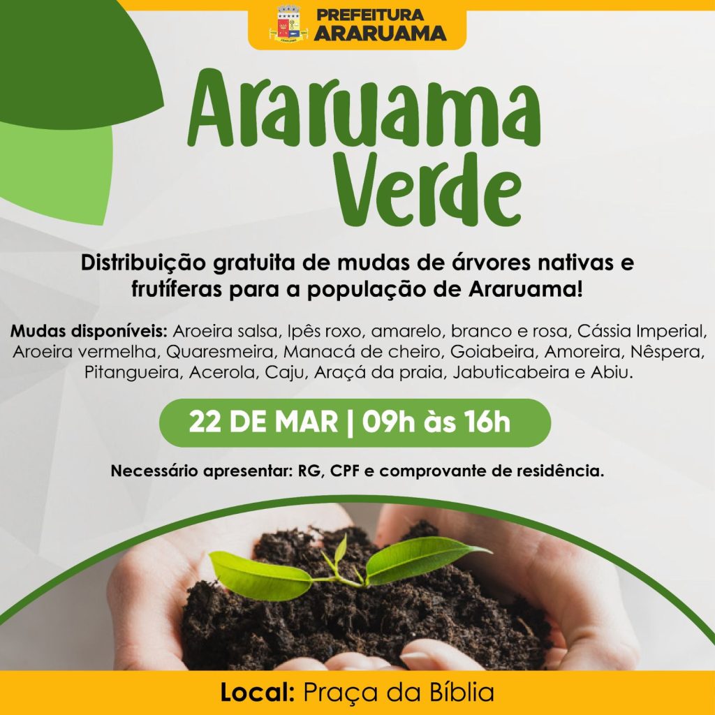 A Prefeitura de Araruama, por meio da Secretaria de Ambiente, Agricultura, Abastecimento e Pesca, vai realizar mais uma distribuição gratuita de mudas de árvores nativas e frutíferas aos moradores, com o projeto Araruama Verde.