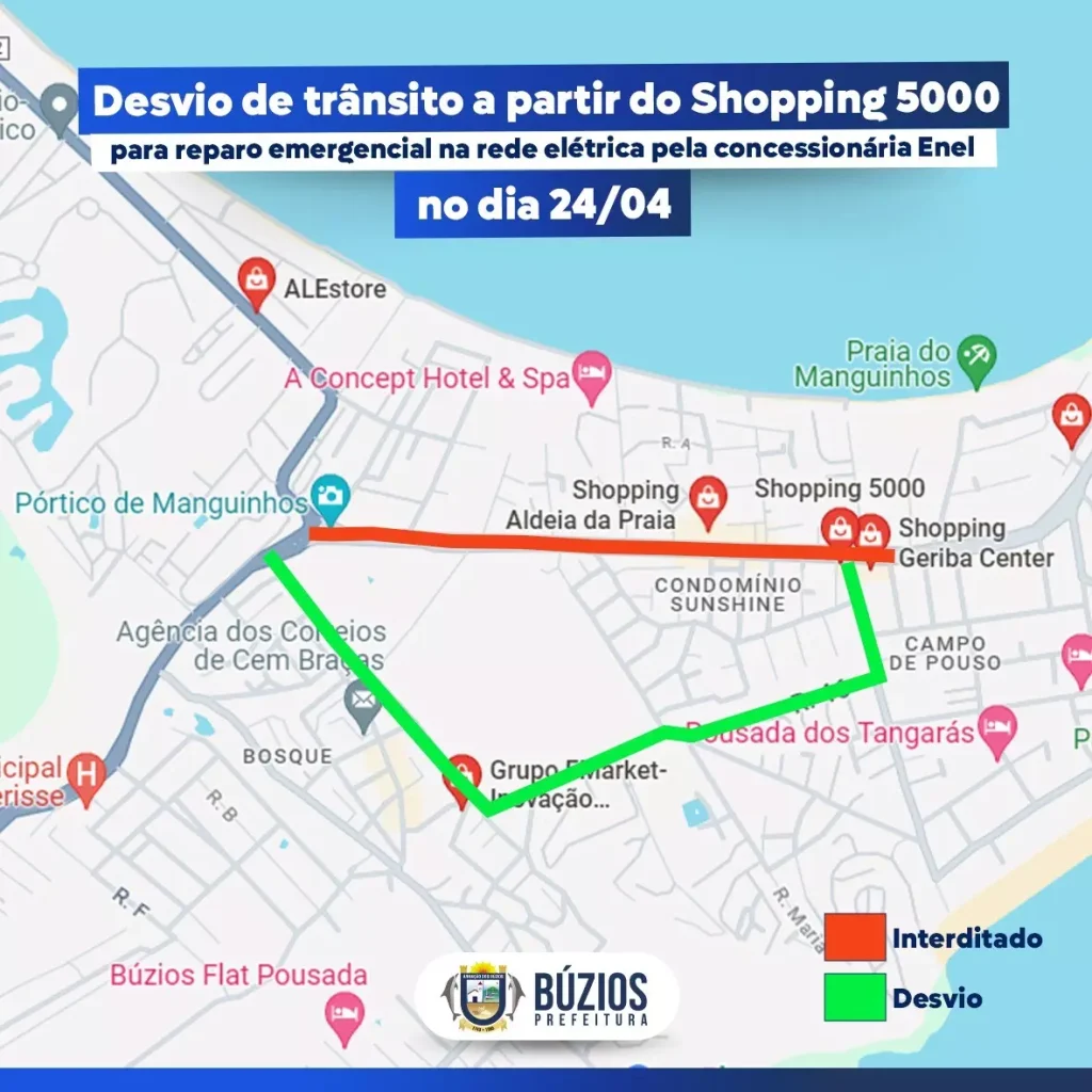 A Prefeitura de Búzios informa que o trânsito do Centro da cidade, no trecho entre o Shopping 5000 e o Centro de Informação Turística (Pórtico), será desviado das 8h às 17h, solicitado pela Concessionaria Enel para construção de rede elétrica e realocação dos postes no local. Quem sai da cidade deve ter atenção redobrada na Avenida José Bento Ribeiro Dantas a partir do Shopping 5000, em Manguinhos.