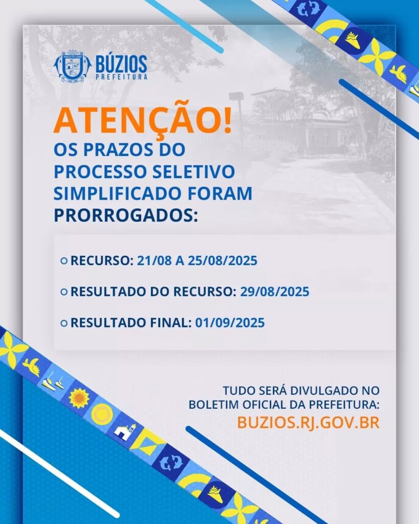 A Prefeitura de Búzios, por meio da Comissão de Acompanhamento do Processo Seletivo Simplificado da Secretaria Municipal do Ambiente, Licenciamento Ambiental e Urbanístico e Fiscalização, informa a prorrogação dos prazos referentes ao Edital SEAUR nº 01/2025, destinado à formação de cadastro reserva para contratação temporária.