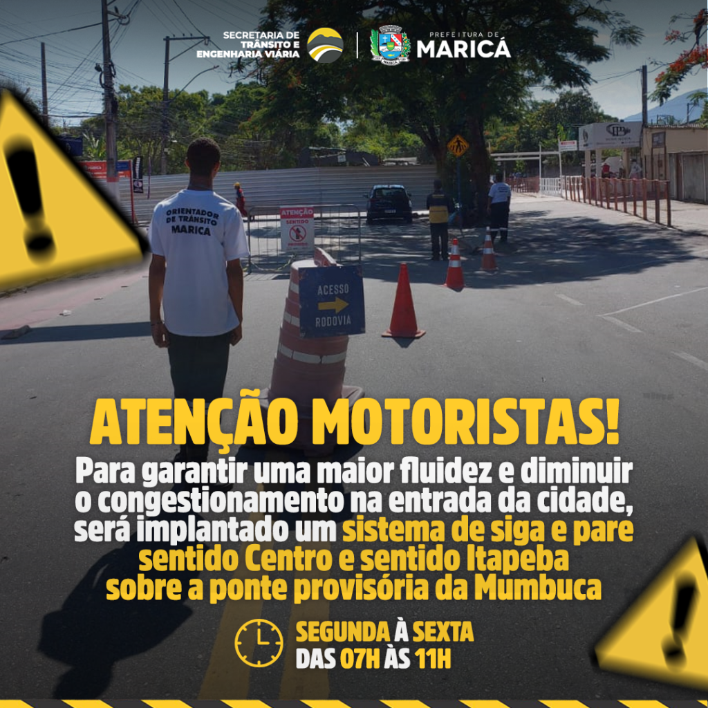 A Prefeitura de Maricá, por meio da Secretaria de Trânsito e Engenharia Viária, aderiu ao sistema siga e pare de segunda à sexta-feira, das 7 às 11h, na ponte provisória da Mumbuca. A medida, que é exclusiva para veículos leves, visa dar fluidez ao trânsito da cidade por causa do alto fluxo de veículos, no período da manhã, na Avenida Vereador Francisco Sabino da Costa, principal acesso ao Centro do município.
