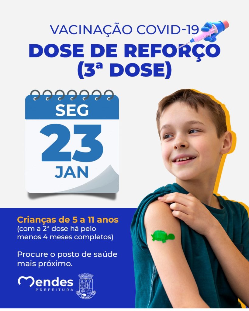 A partir de segunda-feira, 23 de janeiro, todas as crianças de 05 a 11 anos, 11 meses e 29 dias poderão se vacinar com a dose de reforço (TERCEIRA DOSE), da covid-19.