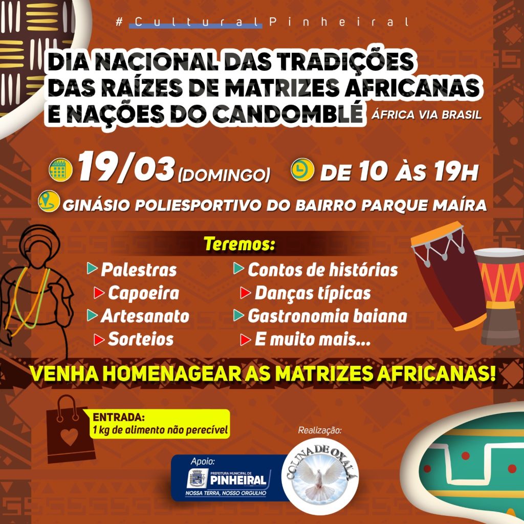 A Prefeitura de Pinheiral, por meio da Secretaria Municipal de Esporte, Cultura, Lazer, Juventude e Turismo (SEMECULT), apoia a realização de mais um evento cultural na cidade. Desta vez é a feira Africa via Brasil, dia nacional das tradições, promovido pela Casa da Colina de Oxalá, que acontece no dia 19 de março, no Ginásio Poliesportivo do bairro Parque Maíra, das 10 às 19 horas.