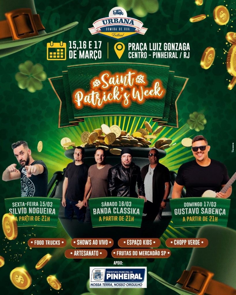 A Prefeitura de Pinheiral, por meio da Secretaria de Esporte, Cultura, Lazer, Juventude e Turismo (Semecult) promove, em parceria com o Urbana Comida de Rua o evento “Saint Patrick’s Week” – Dia de São Patrício – festa da cultura irlandesa, que será promovida, nos próximos dias 15, 16 e 17, na Praça Luiz Gonzaga, Centro. O Dia de São Patrício é comemorado em 17 de março, e é uma das festas mais populares da cultura do país que incluem desfiles, eventos culturais, música, dança e a apreciação da cerveja em pubs locais, sendo celebrada não apenas na Irlanda, mas também em muitos outros lugares ao redor do mundo.